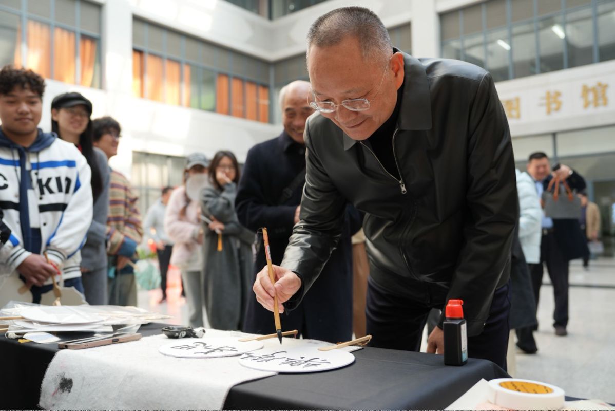随后,与会嘉宾同学生代表一同参观了本次通识美育展览作品。王发元与吴永桥在学生们的期待下,共同在扇面上题字“乐学、善思”,为beat365广大学子送上美好祝愿。