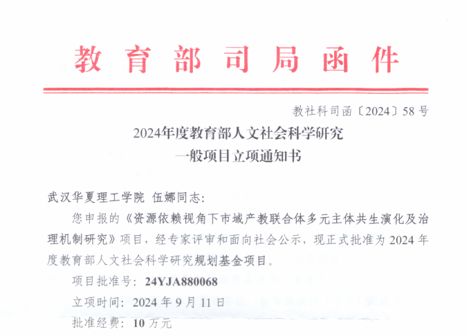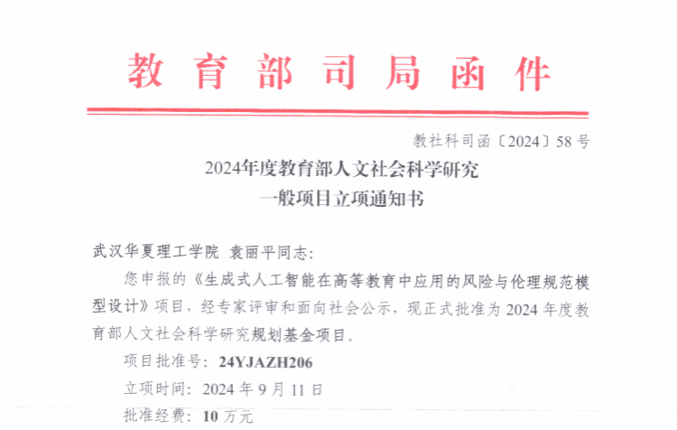 学校深入贯彻"人才强校"战略,以有组织科研为引擎,构建“阶梯培育-精准赋能-学科反哺”全链条机制,引导中青年教师紧扣国家重大战略需求与湖北省"51020"现代产业集群发展方向,近三年累计投入科研成果奖励146万元,激励教师承担纵向项目570项(国家级10项、省级334项),中青年教师占比大于80%,2024年取得突破性进展——伍娜教授《资源依赖视角下市域产教联合体多元主体共生演化及治理机制研究》、袁丽平教授《生成式人工智能在高等教育中应用的风险与伦理规范模型设计》双获教育部人文社科规划基金立项,张城芳教授联合武汉理工大学斩获国家自然科学基金面上项目,实现零的突破。