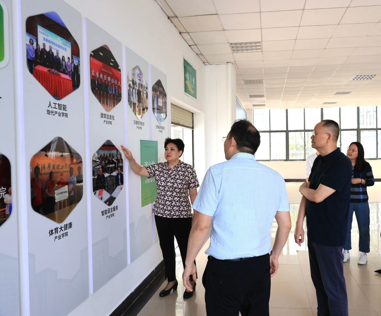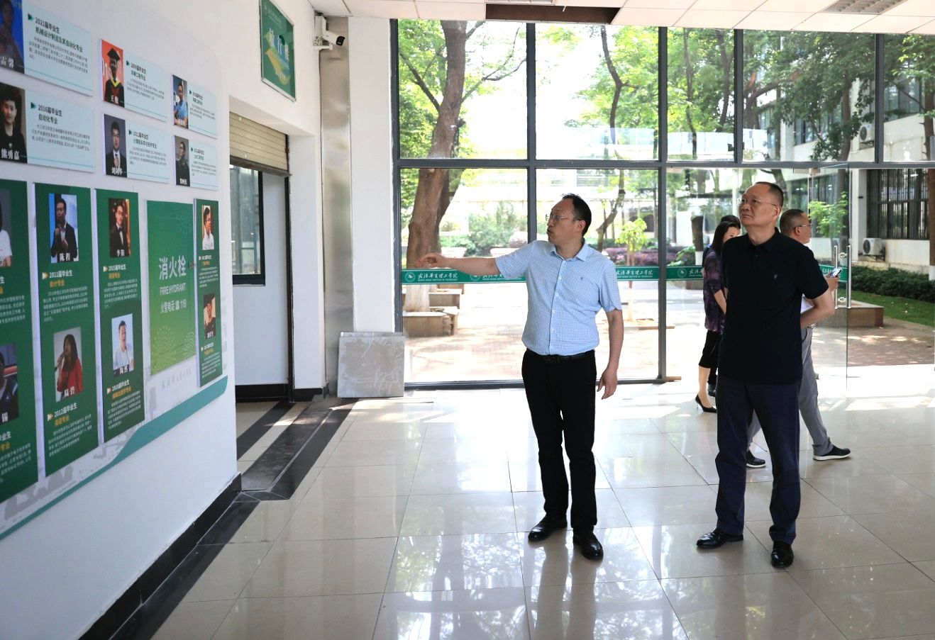 走访过程中,党委宣传部部长龚先军详细汇报了教学楼文化墙项目建设情况。该项目于今年2月启动,在内容设计阶段,学校组织相关人员深入调研校园文化内涵与师生需求,并多次赴湖北商贸学院、武昌工学院等兄弟院校参观学习。设计团队结合学校办学特色、学科优势及育人成果等,精心打造了6个主题板块,涵盖教学成果、现代产业学院、师德风尚、教师成果、杰出校友、学生成果等内容,将教学楼打造成知识传授与文化传承创新的融合空间。