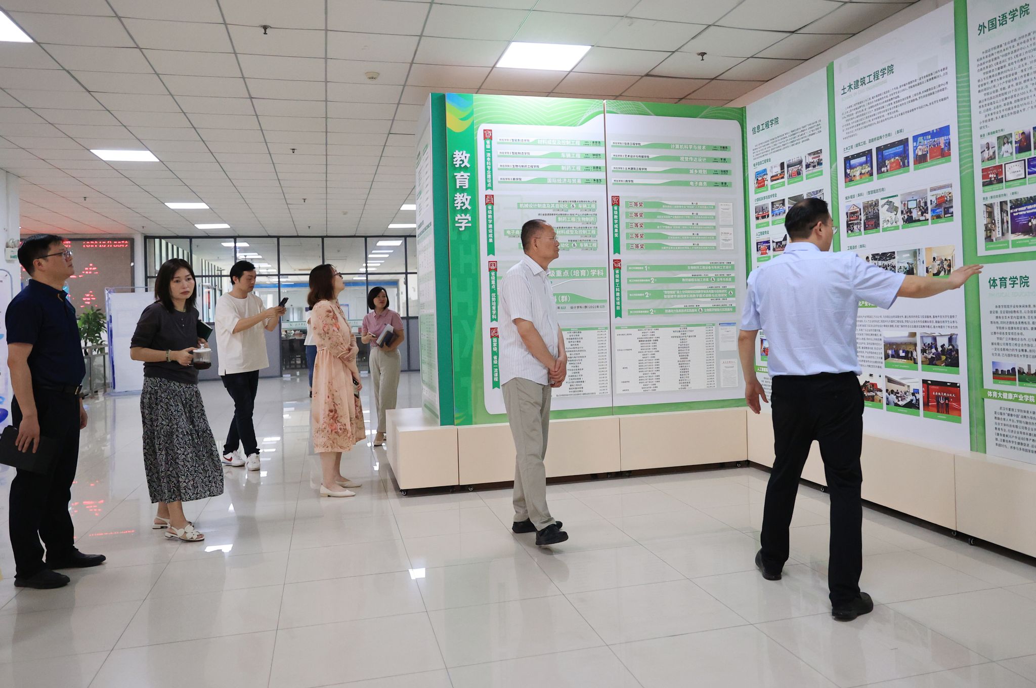 在实地考察过程中,校领导重点参观了各主题展区。在“发展历程”板块,一幅幅珍贵的历史照片生动再现了学校从建校初期的艰苦创业到新时代跨越式发展的奋斗历程;“党建思政”板块系统展示了校党委坚持立德树人根本任务,打造高质量党建引领高质量发展的示范高地的创新实践;“教育教学”板块全面展示了学校在教学改革、专业建设、课程建设等方面的丰硕成果;“师资队伍”展区则展示了学校多年来在人才引进、教师培养、团队建设等方面取得的成绩。校领导不时驻足观看,就展陈细节与工作人员深入交流。