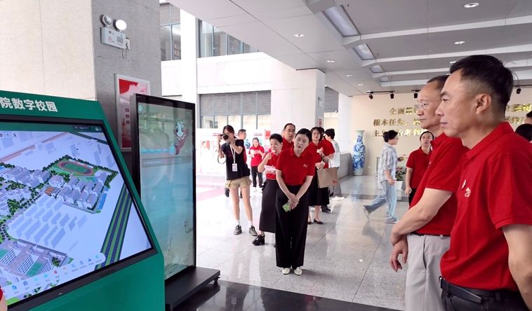 综合楼一楼大厅的数字校园设备吸引众多师生互动。该设备通过数字孪生技术实现“校园三维一张图”,展示学校数字化建设成就。系统采集校园各类数据,构建了高精度三维数字孪生校园,突破二维地图局限,可实时呈现校园全貌与细节。