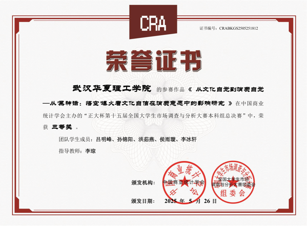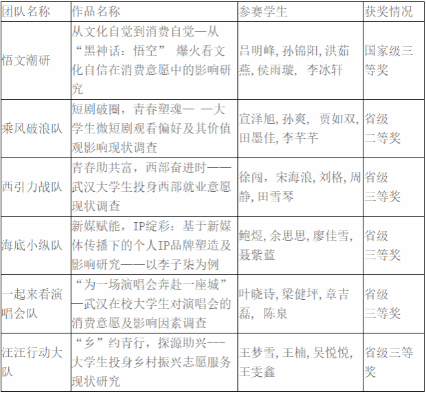 其中,由吕明峰等5名同学组成的“悟文潮研”团队凭借作品《从文化自觉到消费自觉——从“黑神话:悟空”爆火看文化自信在消费意愿中的影响研究》荣获国家级三等奖;“乘风破浪队”的作品《短剧破圈,青春塑魂——大学生微短剧观看偏好及其价值观影响现状调查》获得省级二等奖;其余四支队伍均获省级三等奖。