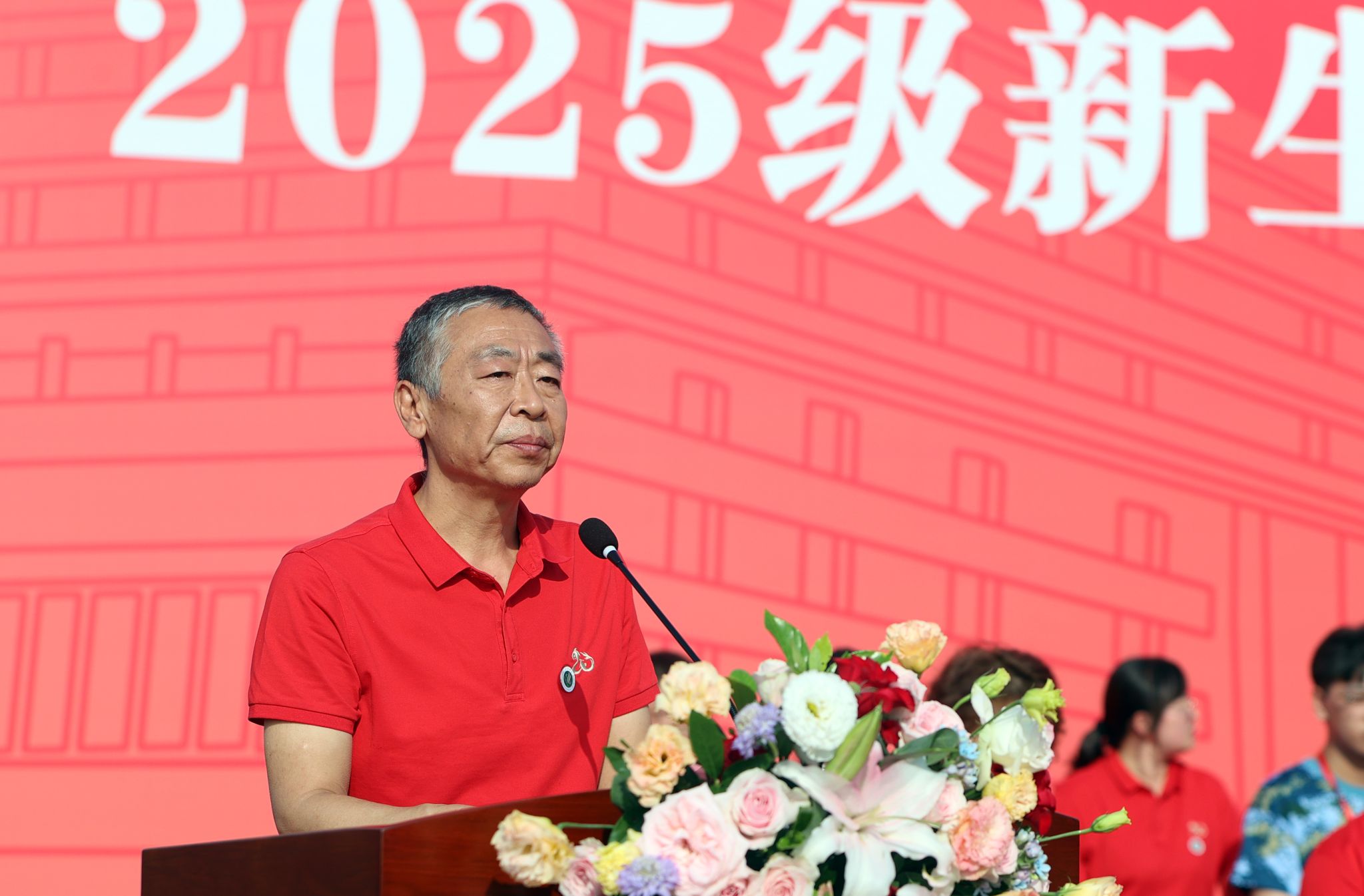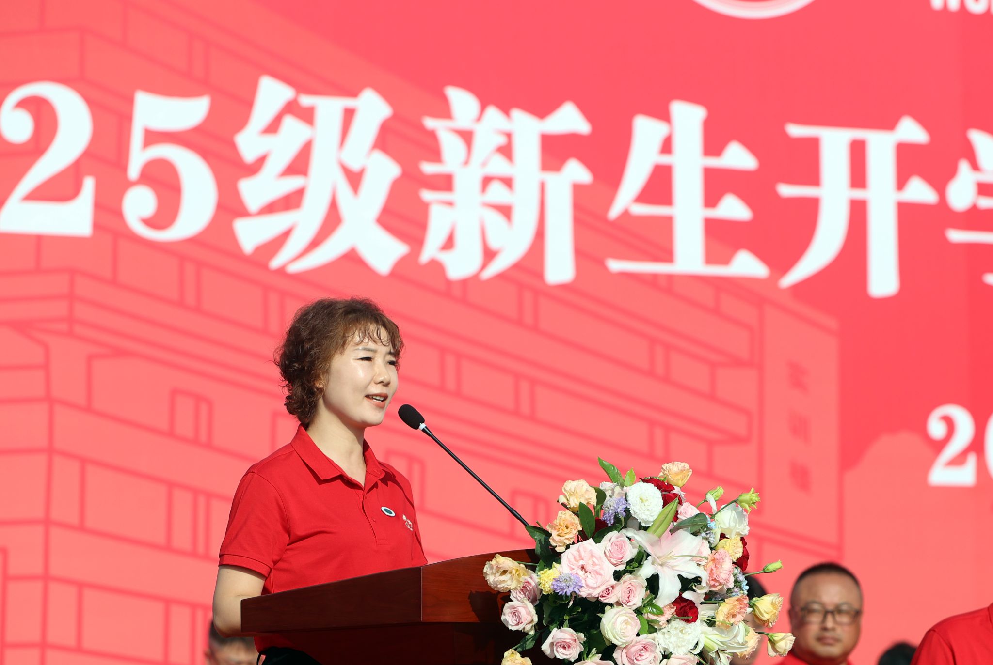 校长吴永桥首先代表学校向全体新生表示热烈欢迎,特别向跨越千里求学的学子以及开学当日过生日的10位同学致以问候。他回顾了学校为迎接新生所做的各项努力,包括高质量完成梧桐湖校区一期建设,精心打造智慧教室、星级公寓、全省最低价热水系统等30余项“暖心工程”,并致力于优秀师资配备等软件的跃升。他提及全体校领导与教师亲自为新生打扫宿舍的细节,寄托着老师对同学们无微不至的关怀,体现了学校以生为本的育人理念。吴永桥向新生提出四点期望:以“德”立心,做胸怀家国的追梦人;以“学”筑基,做求知若渴的探索者;以“行”致远,做躬身入局的实干家;以“新”铸魂,做百折不挠的奋斗者。他希望全体学生牢记“立德、乐学、笃行、日新”的校训精神,在学校敢闯敢创、持续超越、学有所成,以开拓进取服务社会,以聪明才智贡献国家。