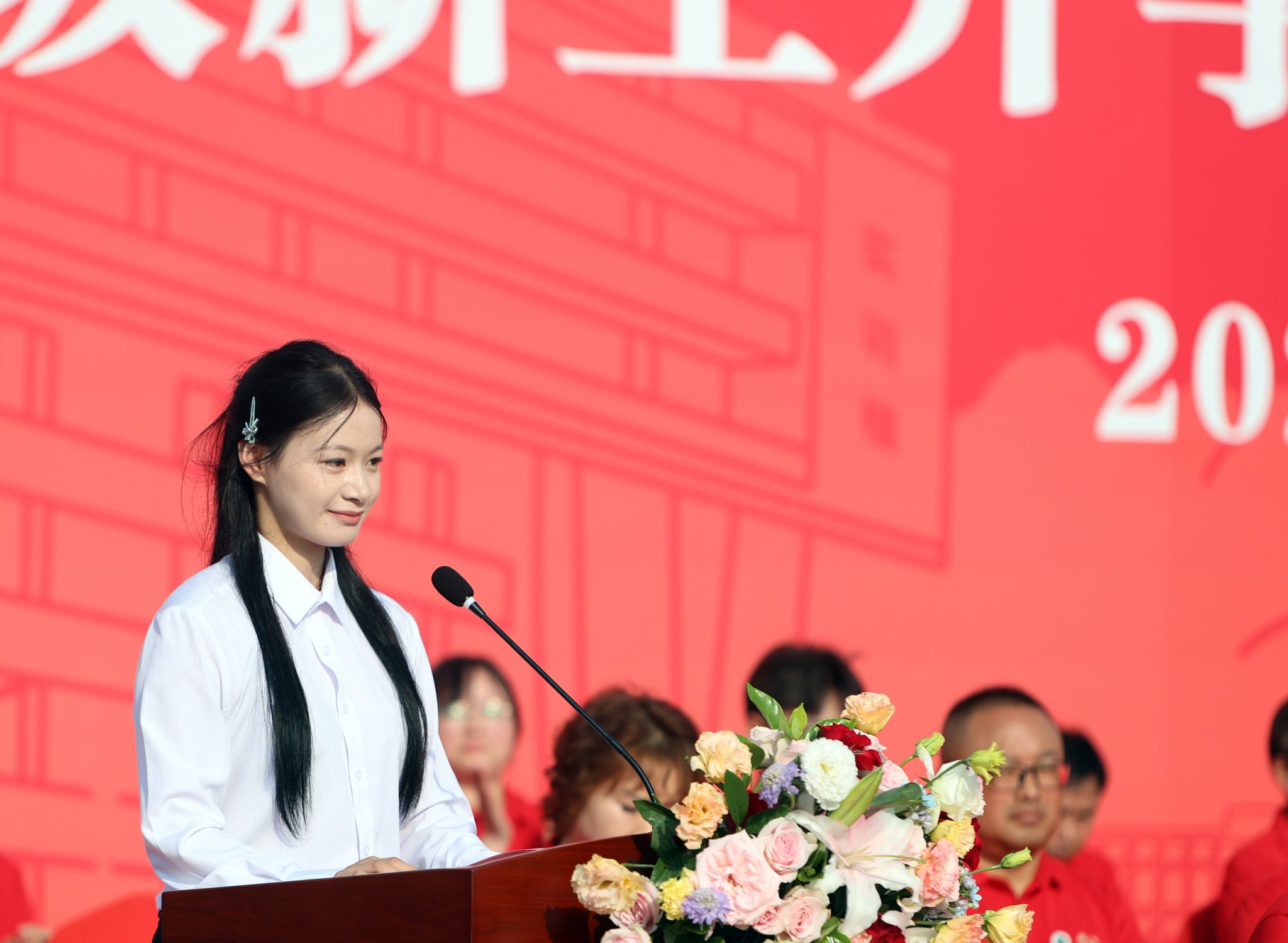 体育学院休体1222班吴利作为老生代表发言。她回顾了自己三年来专业综测第一,带队获多项国家级、省级健美操奖项,服务超2000名学生,并入选省“千师百校”支教项目的经历。她号召新生心怀理想、勤学笃行、投身实践,将个人梦想融入体育强国战略,以校训精神书写青春篇章。