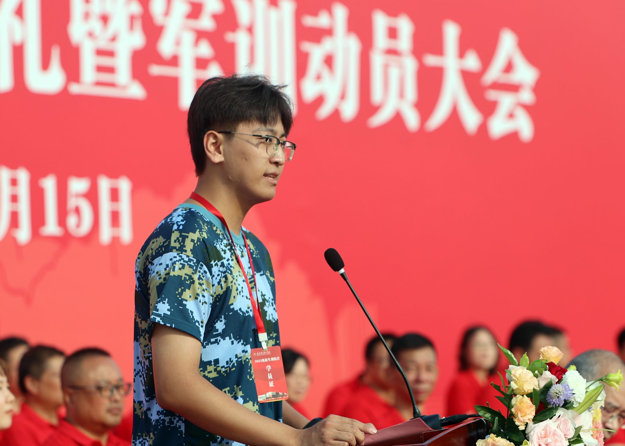 商学院工商管理1253班熊一茗代表全体新生发言。他向学校领导、师长、志愿者及父母致以诚挚感谢,并呼吁同学们以军训为起点,锤炼意志、严明纪律,将迷彩记忆化作成长的第一笔财富。他表示,将依托学校优质平台,在课堂、图书馆、实验室、双创赛场和社会实践中练就本领,把论文写在祖国大地上,用奋斗为青春写下鲜亮注脚,努力成长为堪当中国式现代化重任的新时代青年。