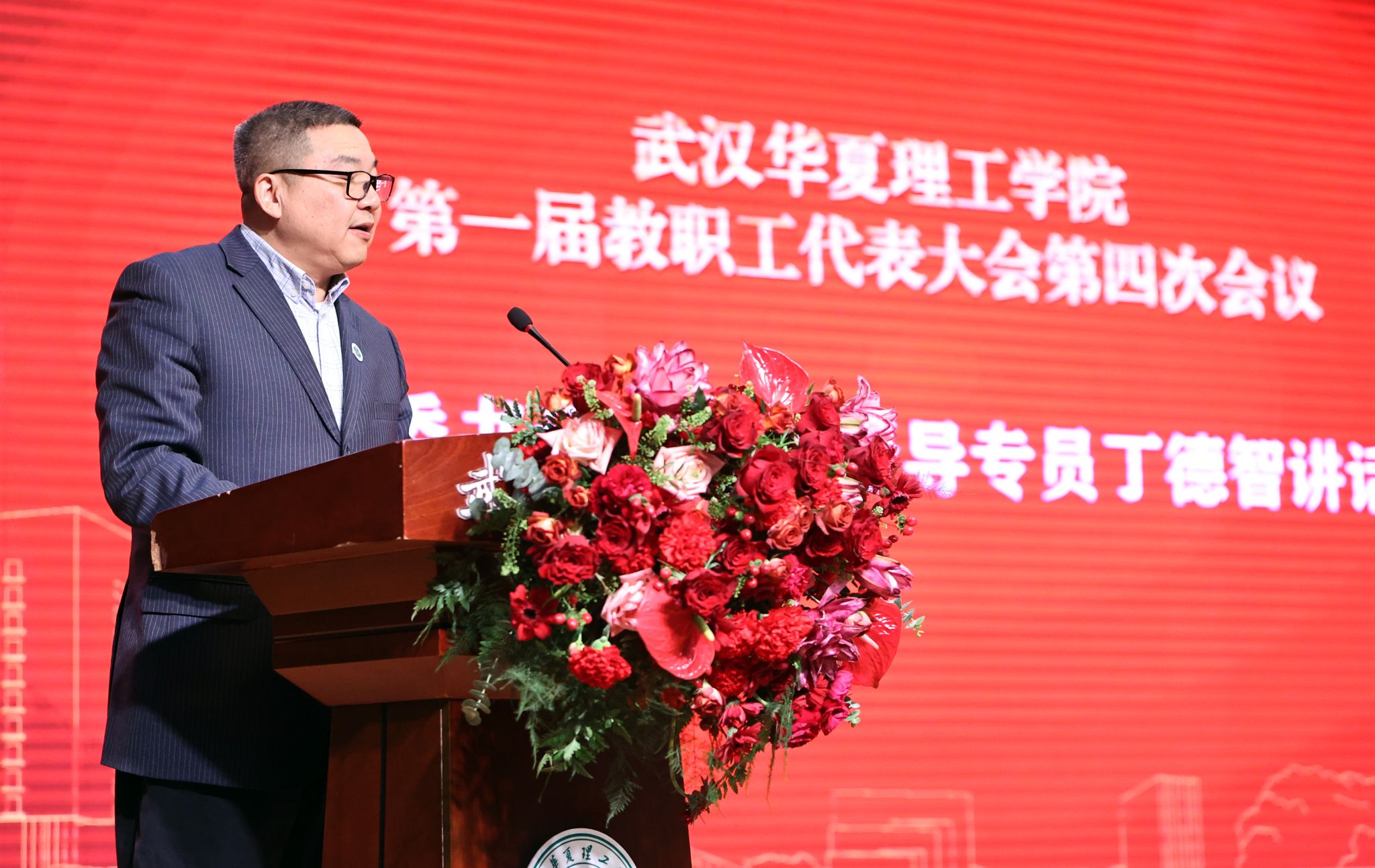 校党委书记、教育督导专员丁德智在闭幕式上发表重要讲话。他首先对大会圆满成功表示祝贺,向认真履职的代表和工作人员致以感谢,并向在本科教学合格评估中付出艰辛努力的全校师生致以崇高敬意。他指出,本次教代会是一次凝心聚力、继往开来的大会。他强调,2025年学校取得的最重要成就便是顺利完成本科教学合格评估,这项成绩凝聚了全体师生的心血,是对学校办学实力的全面检验与认可。