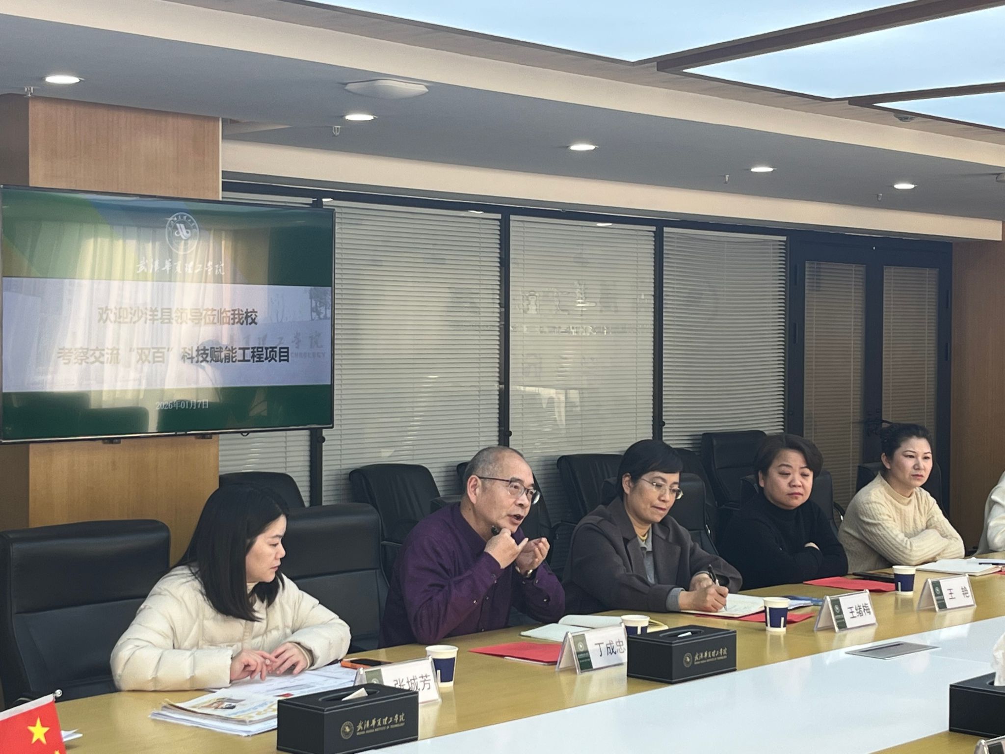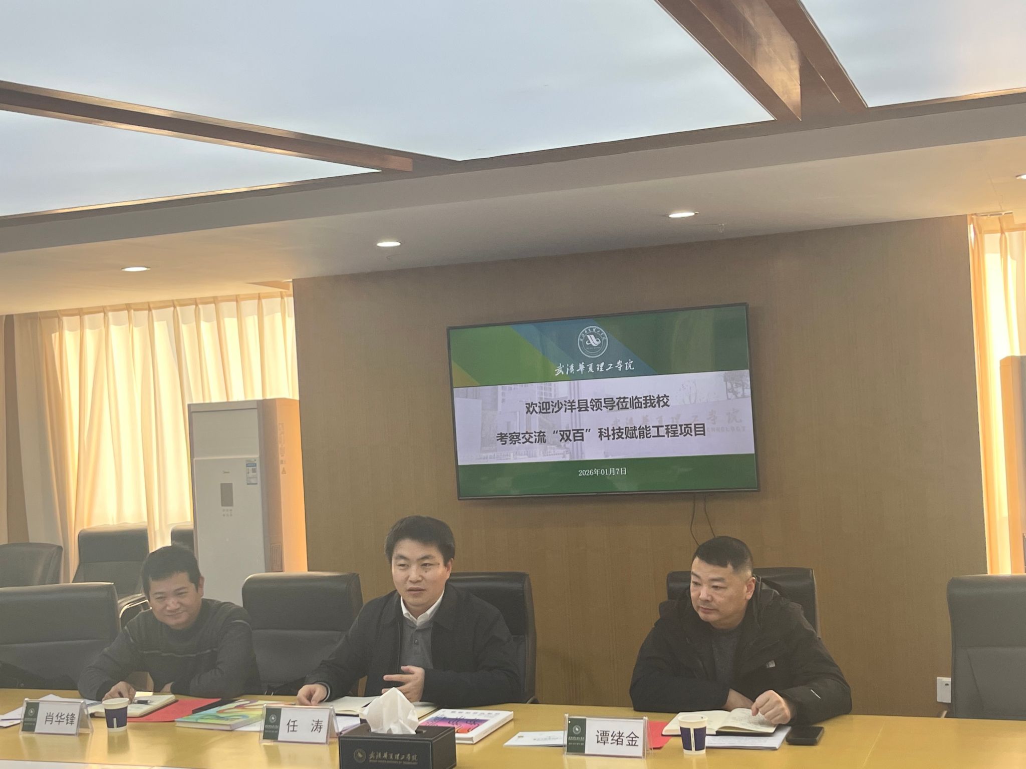 为贯彻落实湖北省 “双百” 科技赋能工程部署要求,搭建校地合作桥梁,推动产学研深度融合,2026 年 1 月 7 日下午,沙洋县领导来访beat365,在综合楼 1402 会议室隆重召开校地合作对接与产业融合发展交流会。沙洋县人民政府副县长任涛、科经局局长肖华锋、副局长谭绪金等县领导一行,副校长丁成忠,科研部部长张城芳、科研管理办公室主任戴伟及相关二级学院副院长等出席会议,会议由丁成忠主持。