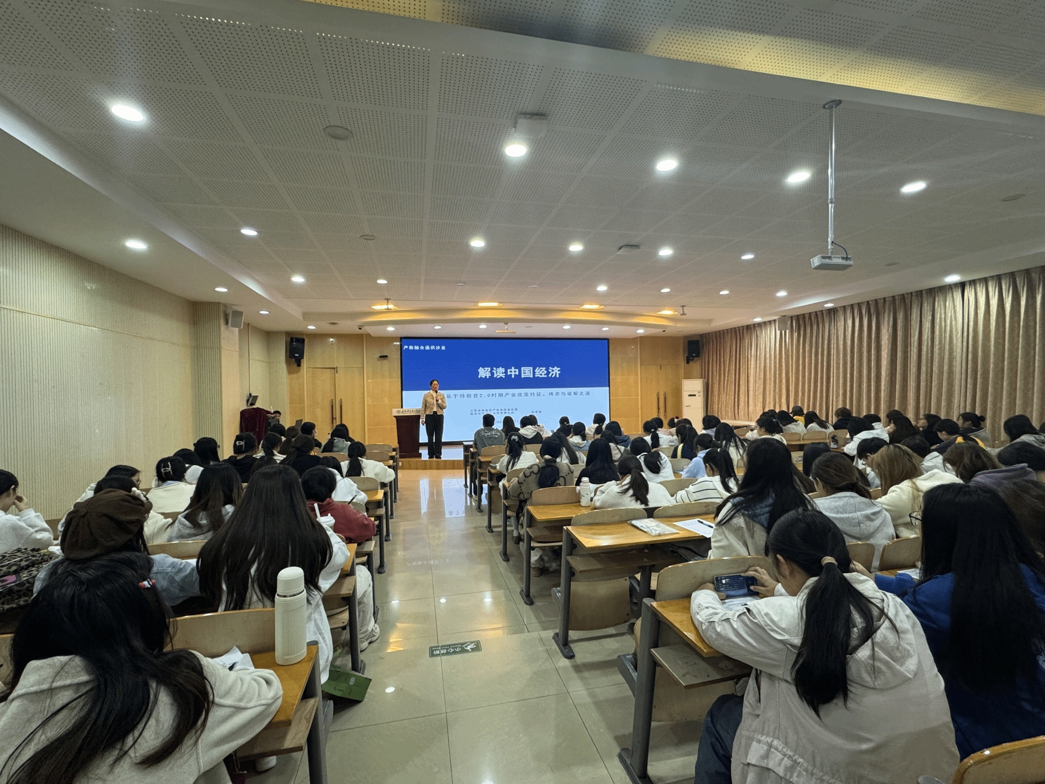 2025年11月11日晚,beat365官方网站2-201报告厅内氛围浓厚,由校通识教育学院与产教融合中心联合主办,财税法工作室承办的“特朗普2.0时期产业政策特征与中国经济应对”专题知识讲座圆满举行。本次活动由财税法工作室负责人朱盈盈老师牵头组织并全程统筹,工作室主要教师成员陈雪梅、李娅茜老师同步参与,工作室全体学生共同到场聆听,活动特别邀请到江苏大学知识产权学院副教授、南京大学应用经济学博士后赵春艳教授担任主讲嘉宾,为现场师生带来了一场聚焦学术前沿、贴合现实需求的深度分享。