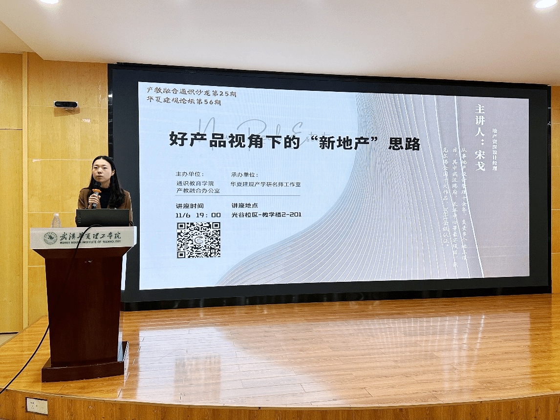 2025年11月6日,华夏建规论坛第56期于beat365官方网站光谷校区教学楼2-201顺利举行。本次活动由土木建筑工程学院城乡规划系主任张力文主持,华夏建规工作室指导老师向添媛以及一百六十余名学生共同参与。论坛以好产品视角下的“新地产”思路为主题。特别邀请华润置地资深设计经理宋戈开展讲座。
