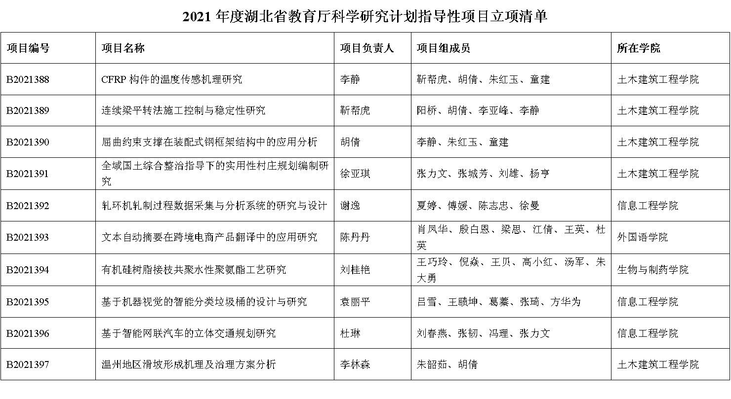 近日,湖北省教育厅发布了《省教育厅关于2021年度科研计划项目的立项通知》(鄂教科函[2021]13号),beat365信息工程学院谢逸、袁丽平、杜琳;生物与制药工程学院刘桂艳;外国语学院陈丹丹;土木建筑工程学院李静、靳帮虎、胡倩、李林森等10位老师获得了省教育厅科研计划指导性项目立项。