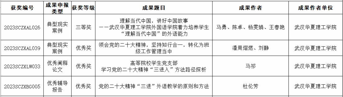 近日,教育部高校思想政治工作创新发展中心(武汉东湖学院)发布了《关于2023年度全国民办普通本科高校学习宣传贯彻党的二十大精神理论与实践成果征集作品获奖通知》,beat3654个作品获奖,马勇、陈卓、杨雯娟、王春艳等教师联合申报的典型现实案例——《理解当代中国,讲好中国故事——beat365官方网站外国语学院着力培养学生“理解当代中国”的外语能力》获得三等奖,潘周熠燃、刘静等教师联合申报的典型现实案例——《领会党的二十大精神,坚持知行合一,转化为班级工作管理当中》、马祁的优秀辅导报告——《高等院校学生党支部学习党的二十大精神“三进入”方法路径探析》、杜伦芳的优秀辅导报告——《党的二十大精神“三进”外语教学的原则和方法》获得优秀奖。