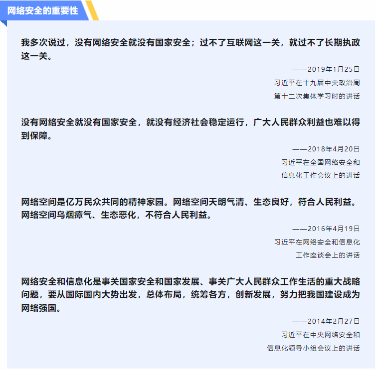 网络安全不仅关乎国家安全和社会稳定,也越来越多地影响到我们的日常工作生活。没有网络安全,就没有国家安全,让我们一起: