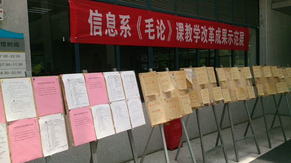 由院两课部李运祥书记指导,信息系同学完成的“《毛泽东思想和中国特色社会主义理论体系概论》课教学改革成果示范展”目前正在综合楼一楼大厅进行展出。本学期,李运祥书记担任了信息系《毛泽东思想和中国特色社会主义理论体系概论》课程的教学工作,他在课堂上对教学方式方法进行了大胆的探索与改革,结合我院转型的要求,提出让同学们“自己动手,自己备课,自己讲课”的方式,锻炼了同学们的能力,取得了较好的课堂效果。同时,通过同学们自己的实践,使同学们的马克思主义理论水平有所提高,世界观、人生观、价值观更加端正。