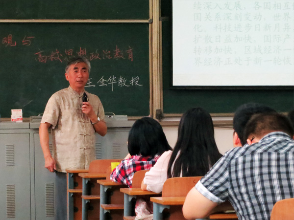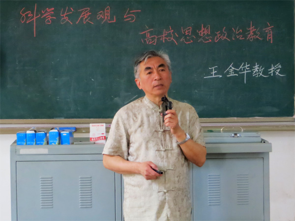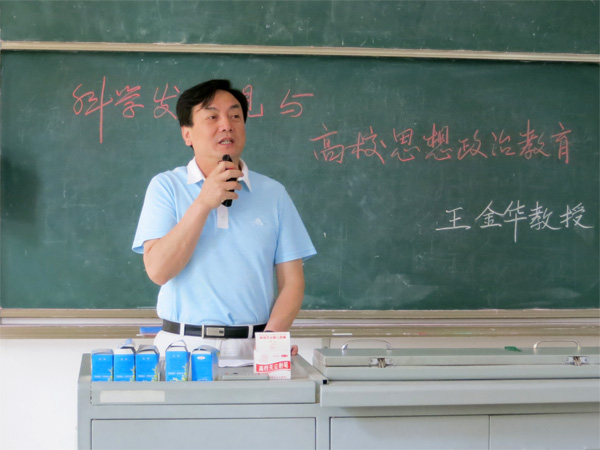 接下来,王金华教授从把握理解“科学发展观”和“高校思想政治教育”两个方面做了演讲。他指出,科学发展观进一步回答了“什么是发展、为什么发展、怎样发展”的重大问题,是和毛泽东思想、邓小平理论、“三个代表”重要思想一脉相承的对马克思主义中国化的发展,赋予了马克思主义关于发展理论的新时代内涵和实践要求,进一步丰富了中国特色社会主义理论,是与时俱进的马克思主义发展观。高校思想政治工作者必须准确把握中央、教育部关于科学发展观的理论精神并带入课堂。