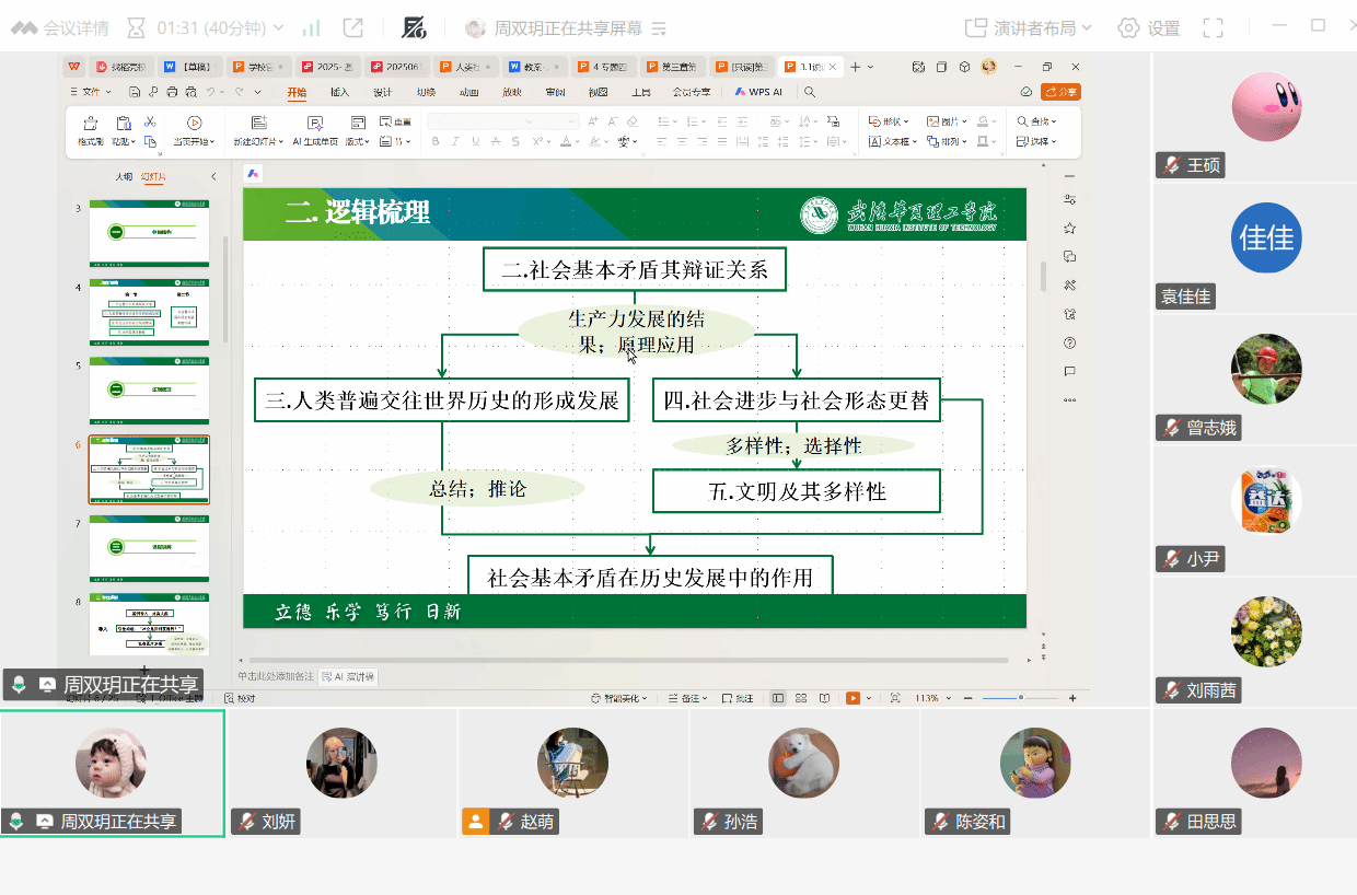 备课会第二部分,周双玥老师继续从经典的“外卖大战”案例出发,引出生产力和生产关系、经济基础和上层建筑的矛盾运动及其规律,以及社会进步和社会形态更替,最后指出文明及其多样性,强调社会基本矛盾在历史发展中的重要作用。