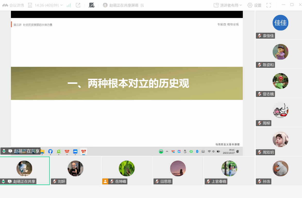 为持续提升《马克思主义基本原理》课程教学质量,提升课程教学质量与育人实效。马原教研室于10月27日20:30通过线上平台召开《马克思主义基本原理》集体备课会。本次备课会主要聚焦于第三章“人类社会及其发展规律”第一节“人类社会的存在与发展”,由马原教研室主任赵萌老师主持,周双玥老师进行说课展示,全体任课老师围绕教学内容展开探讨。