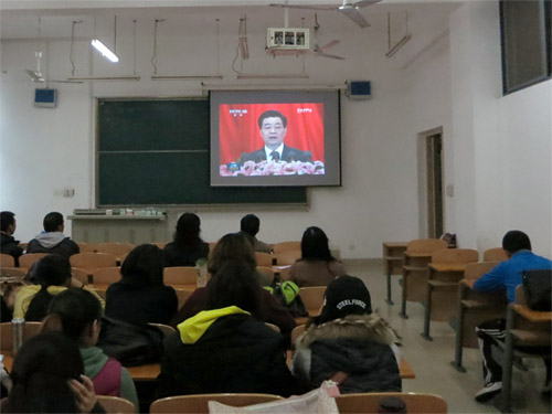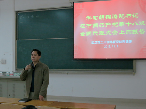2012年11月9日,武汉理工大学华夏学院两课部全体教师学习了胡锦涛总书记在中国共产党第十八次全国代表大会上的报告。学习活动由夏欣老师主持,他首先向大家介绍了胡锦涛总书记在党的第十八大开幕会上作的题为《坚定不移沿着中国特色社会主义道路前进,为全面建成小康社会而奋斗》的报告内容,报告分为12个部分,重点关注了四个方面,包括:过去五年的工作和十年的总结;民生建设;政治体制改革;转变经济发展模式等。之后,全体老师观摩了党的十八大开幕会。