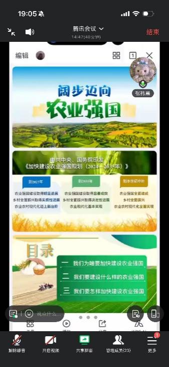 《形势与政策》课程组通过腾讯会议顺利召开了集体备课会。本次会议由刘文莉老师主持,张祎晨老师通过说课形式围绕《阔步迈向农业强国》的内容分享备课心得体会,全体授课教师共同参加,旨在明确本章教学重点,分享教学设计,提升教学质量。