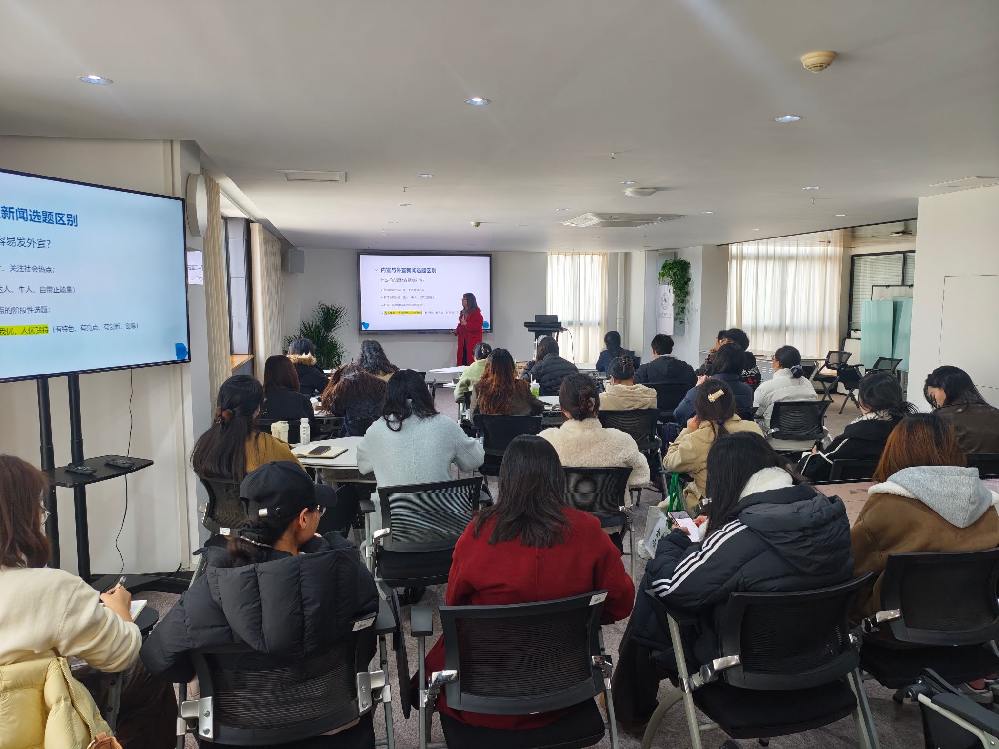 其次,针对内宣与外宣新闻选题的核心差异,张部长给出了清晰阐释。她指出,内宣新闻应立足学院发展实际,重点聚焦院内工作动态与师生精神风貌。同时要突出各类活动的特色亮点与创新举措,以真实鲜活的内容凝聚学院发展共识。外宣新闻则需具备更广阔的视野,紧密对接国家大政方针与社会热点,将学院的育人成果、理论研究与国家战略需求相结合,精准传递马克思主义学院声音,提升学科的社会影响力。