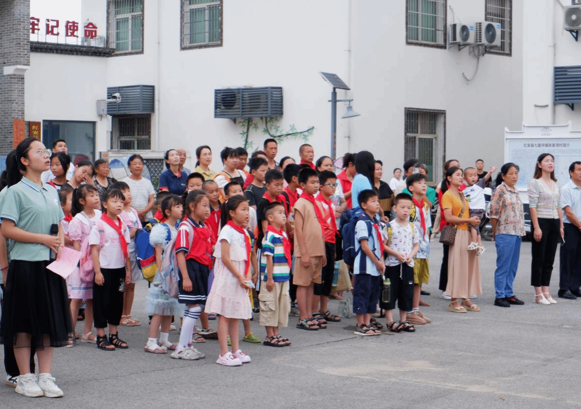 仪式的第一项活动,由支教队成员邓智明带领四名小朋友,升国旗,奏唱国歌。孩子们稚嫩的小手紧握着右拳,眼中闪烁着对未来的无限憧憬,周围的家长们无不为之肃立,感受着这份神圣与自豪。
