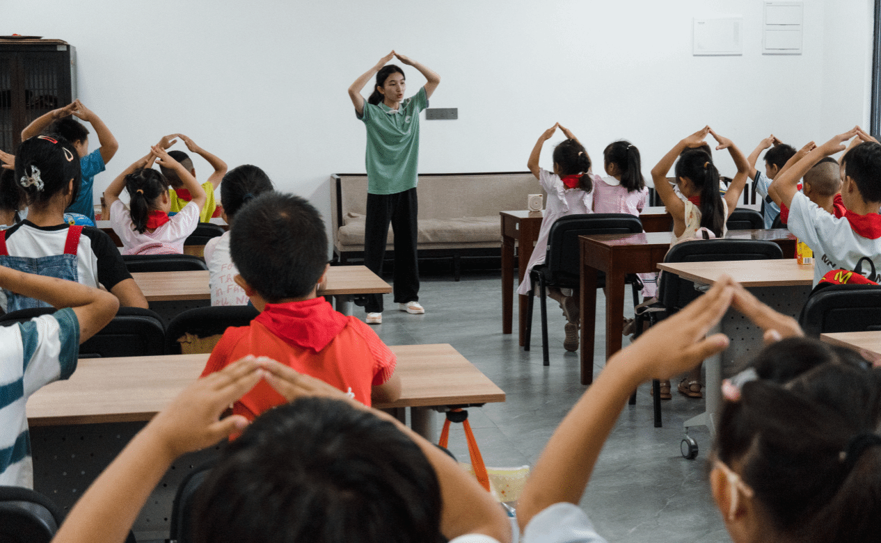 仪式结束后,全体小朋友们移步到教室开启了第一节课,由杨依婷带着孩子们学习一支富有节奏感的手语舞——《国家》。音乐响起,孩子们随着旋律舞动双手,每一个动作都显得那么纯真而充满活力。这不仅是一次身体的律动,更是一次心灵的交流,歌词里唱到的“家是最小国,国是千万家”不仅拉近了彼此间的距离,也让孩子们深刻领悟到了家国情怀。