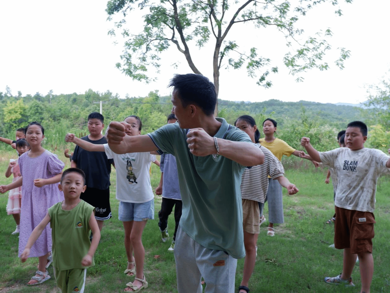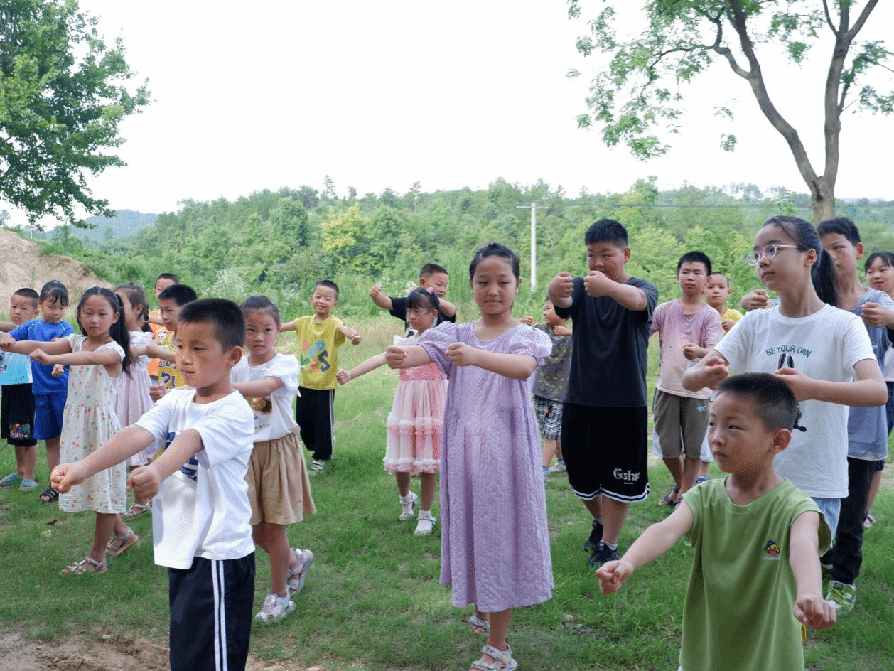 清晨的阳光洒在教室外的操场上,一群孩子跟随着老师的步伐,踏着露水的清新,来到了树林的一角,郁郁葱葱的树木提供了天然的屏障,成为他们晨练的最佳场所。今天,小邓老师带来了一堂特别的课程——军体拳。
