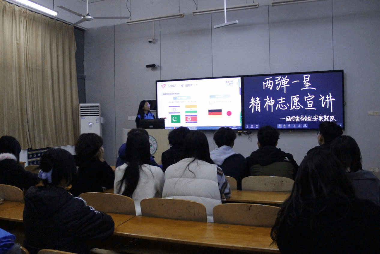 2025年11月5日晚,马克思主义学院励行读书会红安实践队在教学楼2-205教室举办“两弹一星”精神志愿宣讲活动。本次活动以“铀的三生三世”为主线,将核工业发展历程、核科学知识普及与“两弹一星”精神传承相结合,呈现了一场有思想、有温度的主题宣讲。
