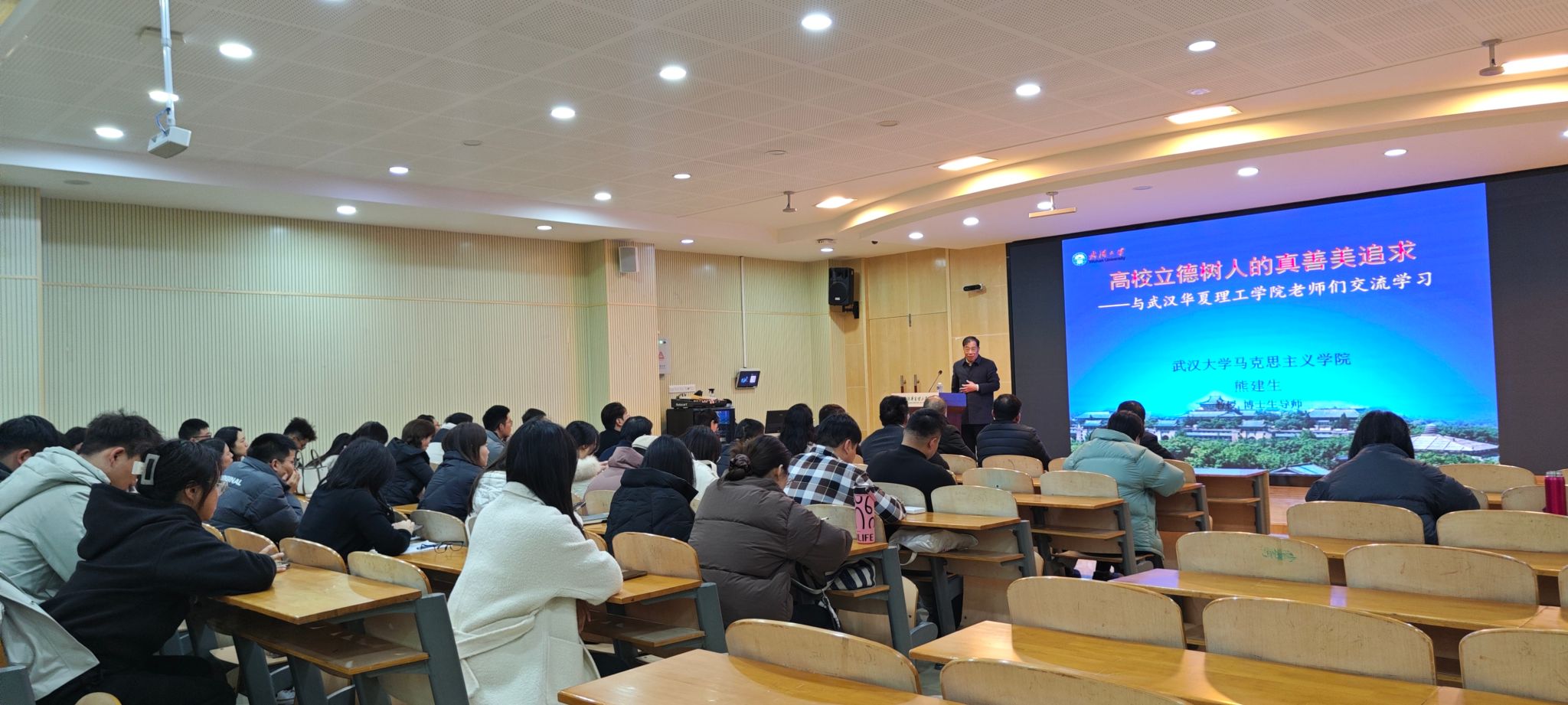 12月11日下午,由马克思主义学院在教学楼2-201开展了“高校立德树人的真善美追求”专题讲座。武汉大学马克思主义学院教授、博士生导师熊建生担任主讲嘉宾,讲座由马克思主义学院直属党支部书记、副院长张丽主持,马克思主义学院全体教师、部分辅导员参加本次讲座。