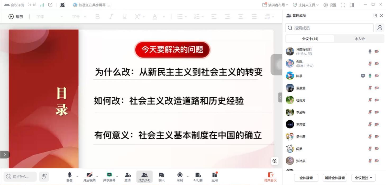 为进一步提升《毛泽东思想和中国特色社会主义理论体系概论》(以下简称“毛概”)课程教学质量,增进教师间的交流与合作,毛概教研室于 2025年9月17日,通过腾讯会议召开了本学期第四次集体备课会。本次备课会由教研室主任程权明主持,陈蓓老师和王惠黎老师通过说课的形式分别围绕“第三章 社会主义改造理论”和“第四章 社会主义建设道路初步探索的理论成果”的内容分享备课心得体会,全体毛概课授课教师共同参与,就该部分教学内容与方法展开了深入研讨。