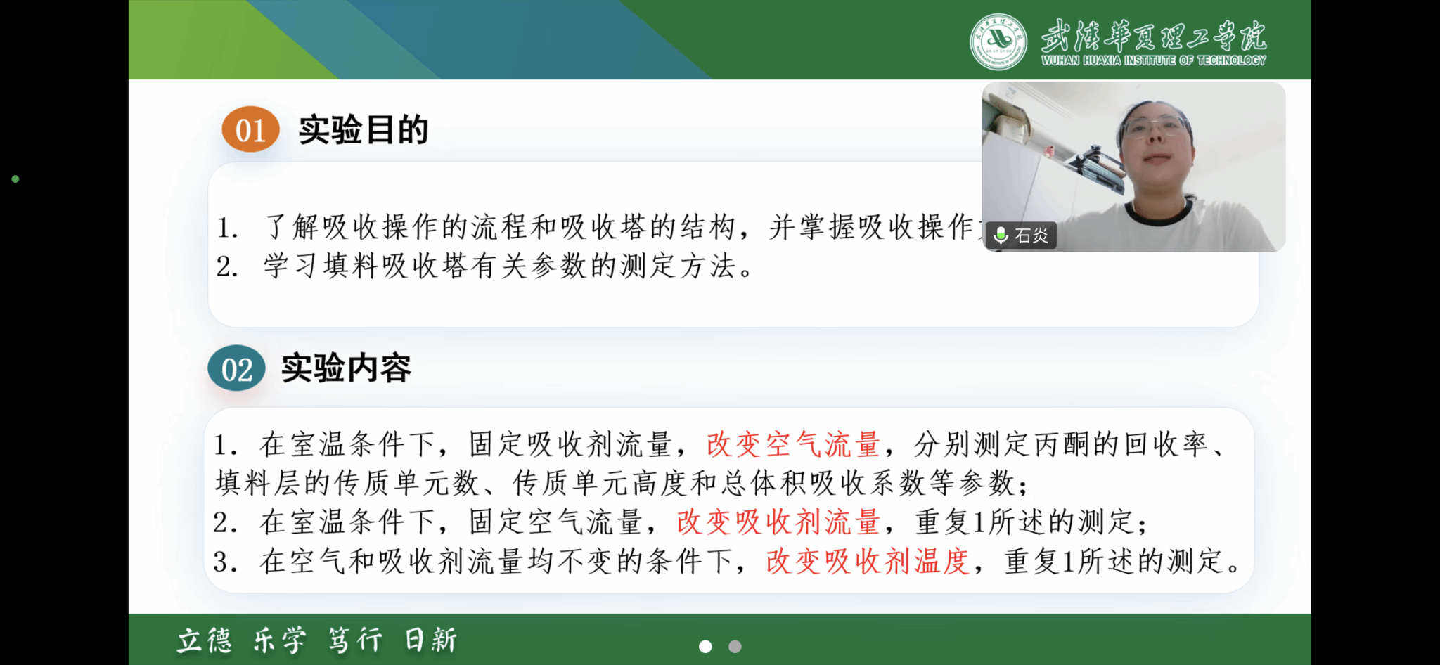 石炎老师此次磨课的课程是化工原理实验,石老师首先利用化工生产常用的填料吸收塔进行了简洁明确的导入,随后以碳酸饮料的例子解释液体吸收气体的原理打开了大家的思维,原本晦涩难懂的原理一下子就好理解了。最后在实验数据记录、数据处理以及实验注意事项等方面进行了详细的讲解。