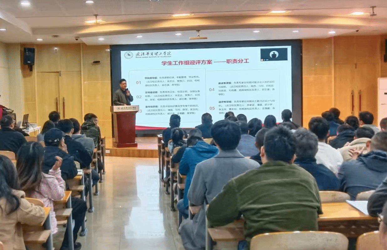 会议同步公布了迎评期间校园文化活动安排及各学院区域分工,同时也对评估期间辅导员的工作提出明确要求:需加强课堂巡查与纪律管理,每日走访学生寝室,严格落实值班制度,并积极组织参与主题班团会等学生活动,全面保障评估期间学生工作有序开展。