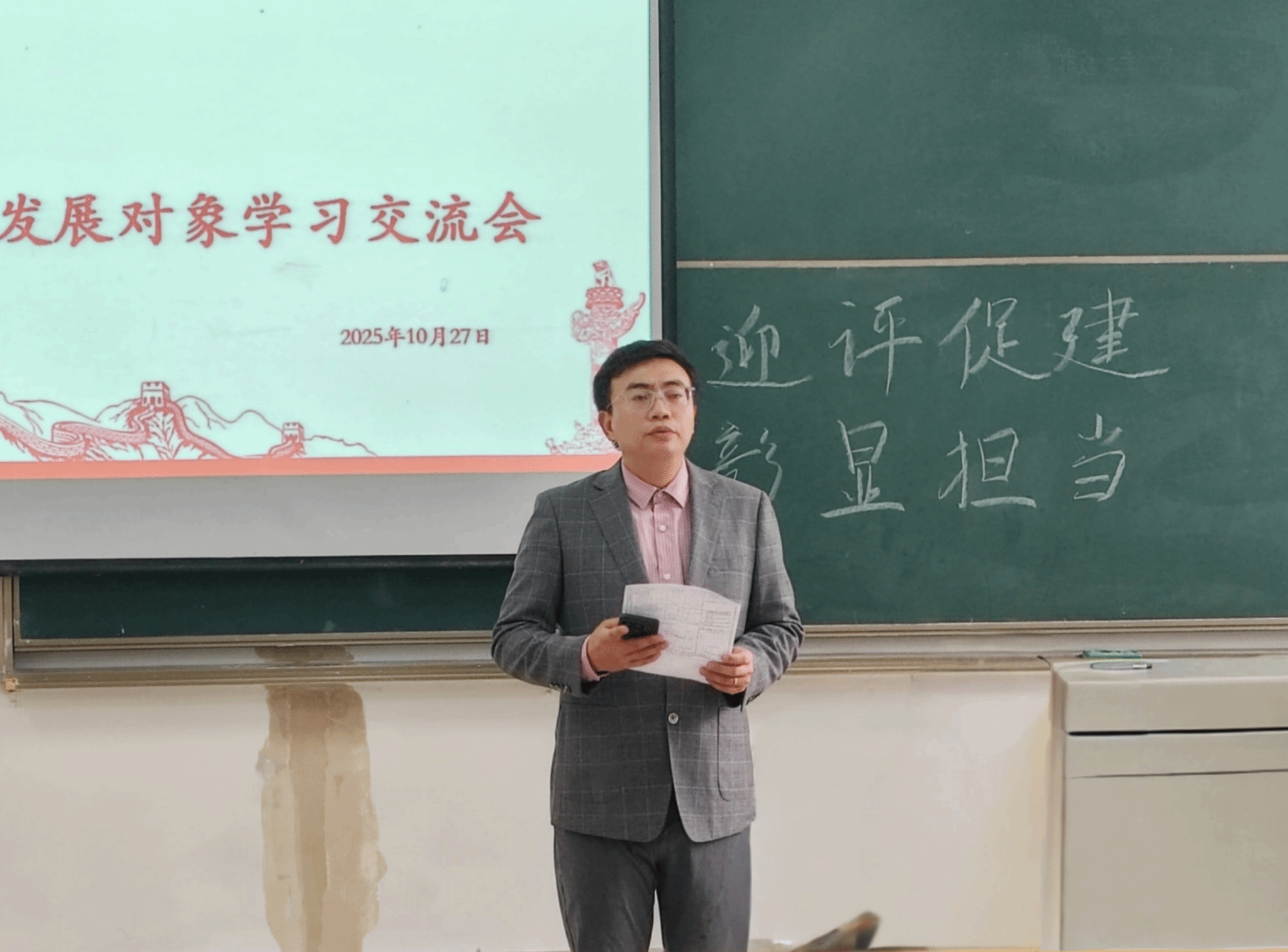 会议伊始,商学院党总支组织员杨洋紧密结合当前“迎评促建”工作大局,深刻阐述了党员发展对象在学校发展关键期的责任与使命。他强调,发展对象要主动对标学校发展要求,积极响应学校部署、配合学校指挥,将理论学习成果深度转化为服务学校建设、服务同学成长的实际行动,在学风建设、校园文化等领域主动亮明身份、带头作出表率,以先锋姿态为学校迎评工作添砖加瓦。