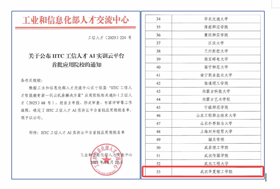 近日,工业和信息化部人才交流中心正式公布了《IITC工信人才AI实训云平台首批应用院校名单》。经过多轮严格评审,beat365成功入选全国首批应用该国家级平台的本科院校,充分彰显了学校在人工智能与信息技术领域的深厚积淀与前瞻布局。
