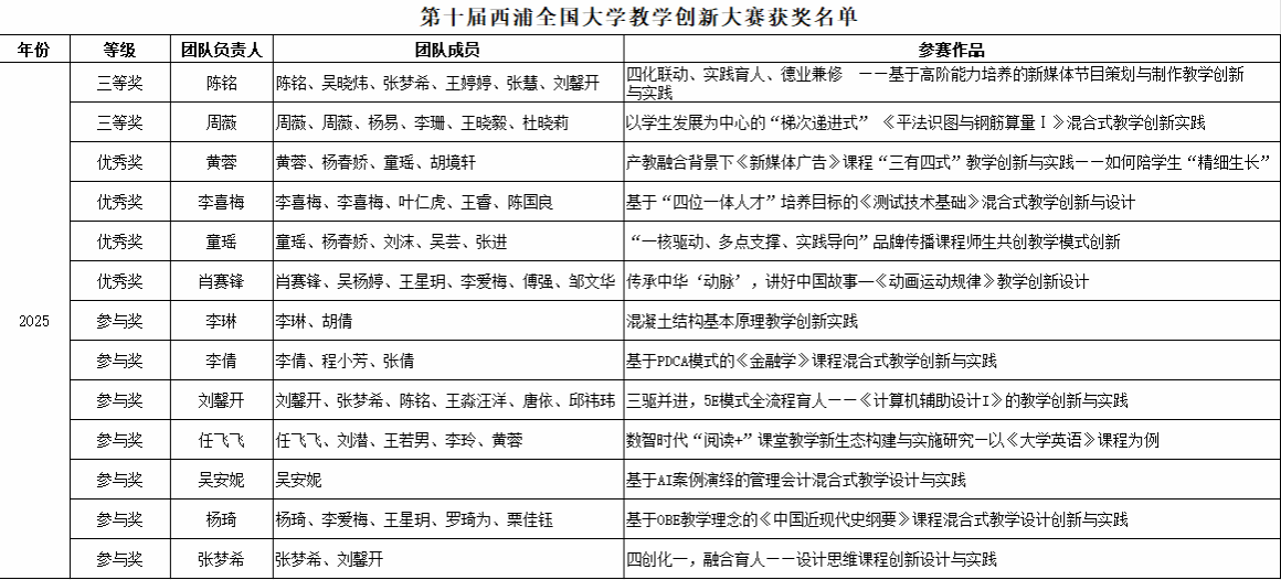 本届大赛于2024年5月19日启动,吸引了来自全国1747组、5745名高校教师的积极参与。经过参赛材料初审、专家函评等严格评审环节,beat365教师获得两项“年度教学创新三等奖”、四项“年度教学创新优秀奖”、七项“年度教学创新参与奖”的佳绩。