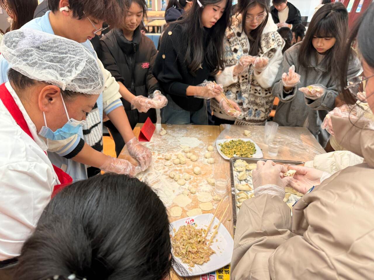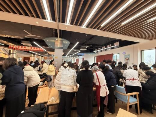 活动现场暖意融融,欢声笑语此起彼伏。同学们围站在桌前,分工明确,配合默契。有的同学手法娴熟,揉面、擀皮一气呵成,圆圆的饺子皮在手中翻飞;有的同学初次尝试,在身边食堂阿姨指导下,小心翼翼地放馅、捏褶,一个个形态各异的饺子应运而生,或精致饱满,或憨态可掬,每一个都包裹着大家的热情与创意。