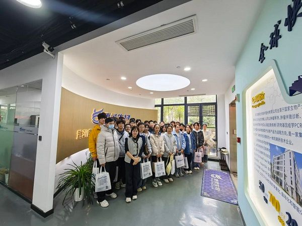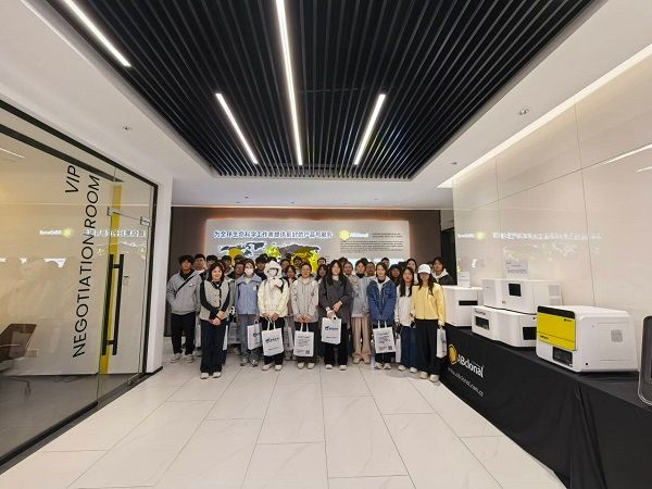 在这里,师生们沉浸式体验了 “试剂研发的全链条创新”:刚进入企业,大家便在产品展示区驻足,一进门,通过产品展示区,近距离观察多种试剂盒等常用产品的实物形态,直观了解不同试剂的应用场景。