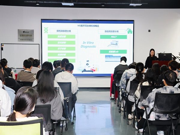 刚踏入康录生物,一面满载专利证书、行业认证与荣誉奖项的展示墙便吸引了师生目光,企业深耕体外诊断领域的科技实力与行业积淀扑面而来。随后,企业系统为同学们讲解了企业发展历程与核心业务:康录生物以肿瘤、心脑血管疾病等重大疾病精准医疗诊断产品为核心战略方向,是集研发、生产、销售及检测服务于一体的高新技术企业,其自主研发的诊断试剂已广泛应用于临床检测一线。