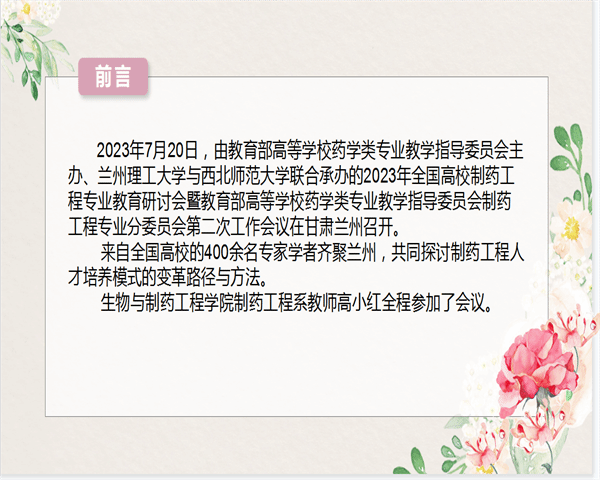 会上高老师首先为大家介绍了2023全国高校制药工程专业教育研讨会的会议主要内容。大会会议第一部分为药学类教指委主任委员、制药工程分教指委委员及高校教师代表们对制药工程专业发展及建设的分析与展望,教育部高等学校药学类专业教学指导委员会主任委员,中国药科大学副校长姚文兵教授作了题为《药学学科专业建设的新进展和新思考》的报告。姚教授详细介绍了药学学科发展现状,分析了面临的挑战,指出药学人才培养的总体思路,号召大家凝聚共识,共同探索基础药学学科人才培养的中国方案。第二部分为企业代表们从企业发展、转型升级出发提出对高校人才培养的建议和期望,上海医药中药研究所所长,正大青春宝药业副总裁刘雳正高级工程师以企业实践为案例做了题为《中药智能制造与精益生产管理的实践与展望》;中国医药集团联合工程有限公司副总经理正高级工程师做了题为《从智能制造看现代制药工厂规划设计的新要求》。第三部分为会议分组讨论,大会分为三个分会场,分别围绕《面向智能制药的教学实践与探索》、《制药工程专业课程思政建设》和《现代信息技术融入制药工程专业教学》三个议题开展讨论。从会议议题可以看出目前制药工程学科重点关注的三个方面的建设。