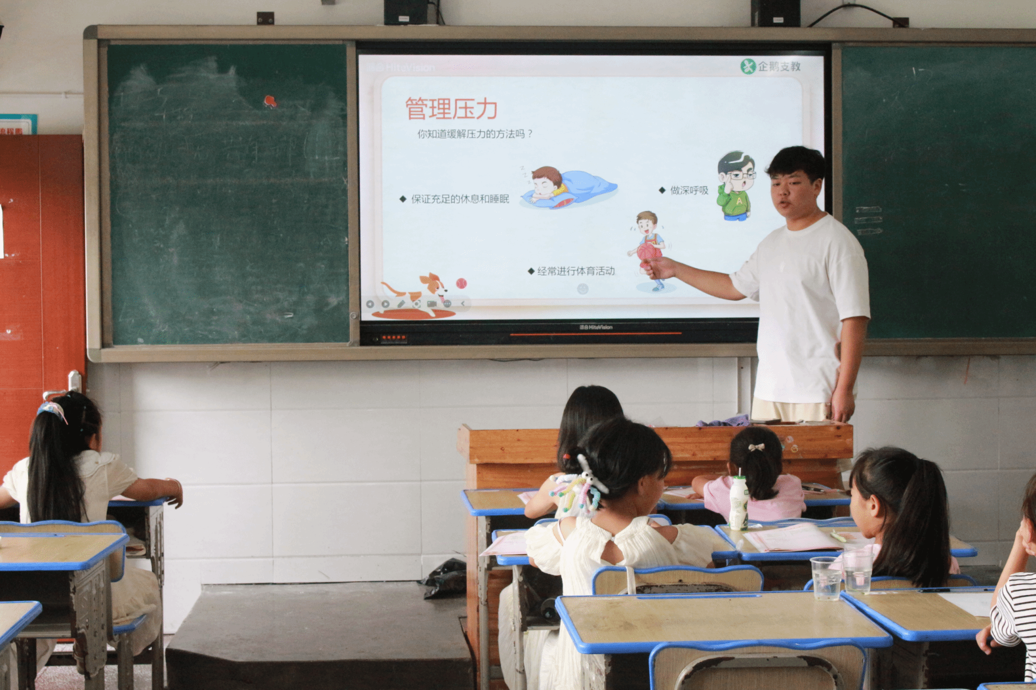 值得一提的是,在此次心理健康课程中,小鱼老师、小新老师和东东老师共同主持开展了多场别具特色的心理辅导活动。比如,他们带领孩子们一起演唱充满正能量的“幸福歌”,让孩子们从旋律和歌词中感受到快乐的力量;同时,还通过手语操的形式教会孩子们如何进行压力调节,让他们在轻松愉快的氛围中释放内心的压力。这种寓教于乐的方式深受孩子们的喜爱,也取得了显著的效果。