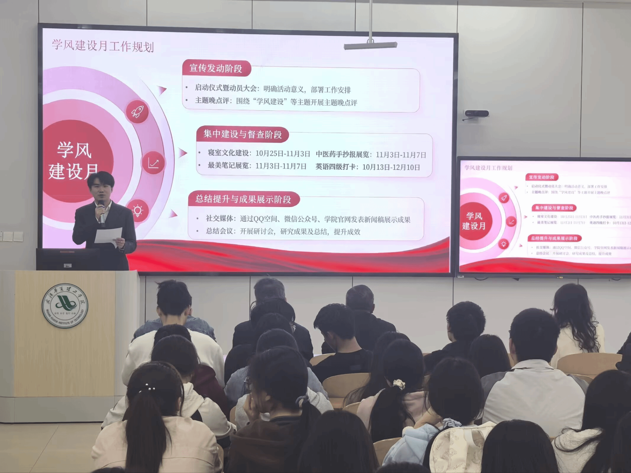 会上,团总支书记林珑率先对学风建设月工作进行详细部署。为打破单一学风建设模式,学院计划分阶段推出系列特色活动:以“主题晚点评”强化思想引领,筑牢学生学习思想根基;以“中医药手抄报展览”结合专业特色,激发学生专业认同感;以“最美笔记”评选树立学习标杆,传递高效学习方法;以“英语四级打卡”搭建互助平台,助力学生突破语言能力瓶颈。通过多元活动矩阵,学院将全面营造“勤学、善思、笃行”的浓厚学习氛围。