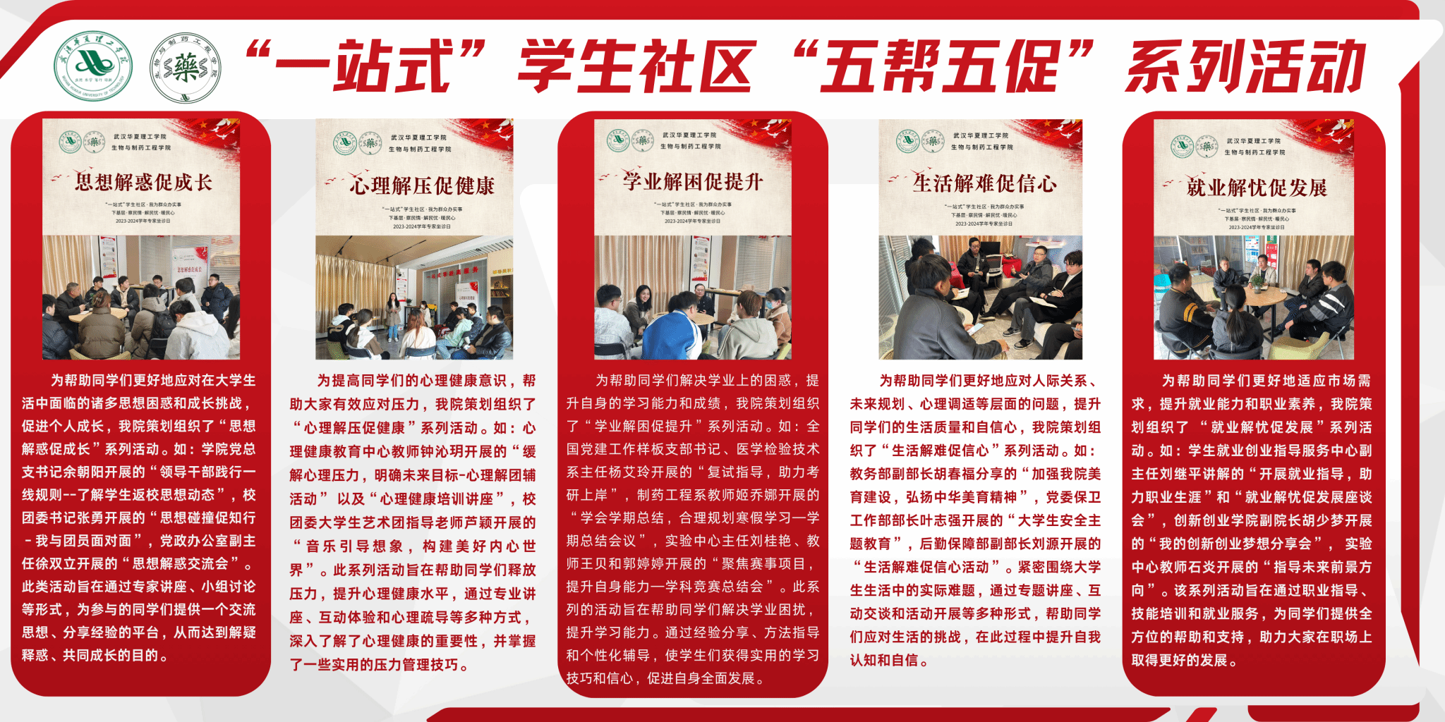 本次公寓文化节系列活动聚焦于五个方面,1.守好思政教育“主阵地”,在思想引领上下功夫。2.走好学风培养“先手棋”,在学风建设上下功夫。3.激活精神文明“驱动器”,在文化培育上下功夫。4.筑牢日常管理“工作网”,在管理教育上下功夫。5.把好就业指导“方向盘”,在就业帮扶上下功夫。陆续开展了“一站式”学生社区“五帮五促”系列活动、学生社区自律委员会主题教育系列活动、党课进社区系列活动、悦·阅在华夏主题阅读活动、“书香华夏,悦享青春”图书现采活动、“寝有独钟,寓你相逢”最美寝室活动、英语学习打卡活动。