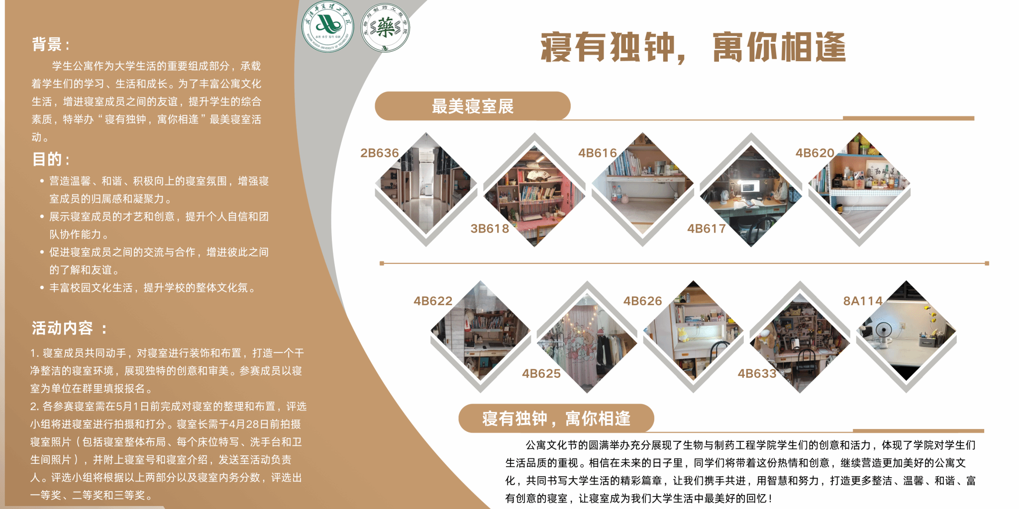 为营造文明、整洁、和谐的公寓环境,展现当代大学生青春风采,优化学生成长成才的生活环境,促进学生公寓精神文明建设,搭建学生思想政治教育工作的平台,使学生从多方面受到良好的思想熏陶,在认真讨论活动方案、积极听取各方面的意见和建议、精心设计活动流程后,beat365官方网站生物与制药工程学院于2024年3月-5月开展了2024年公寓文化节系列活动。