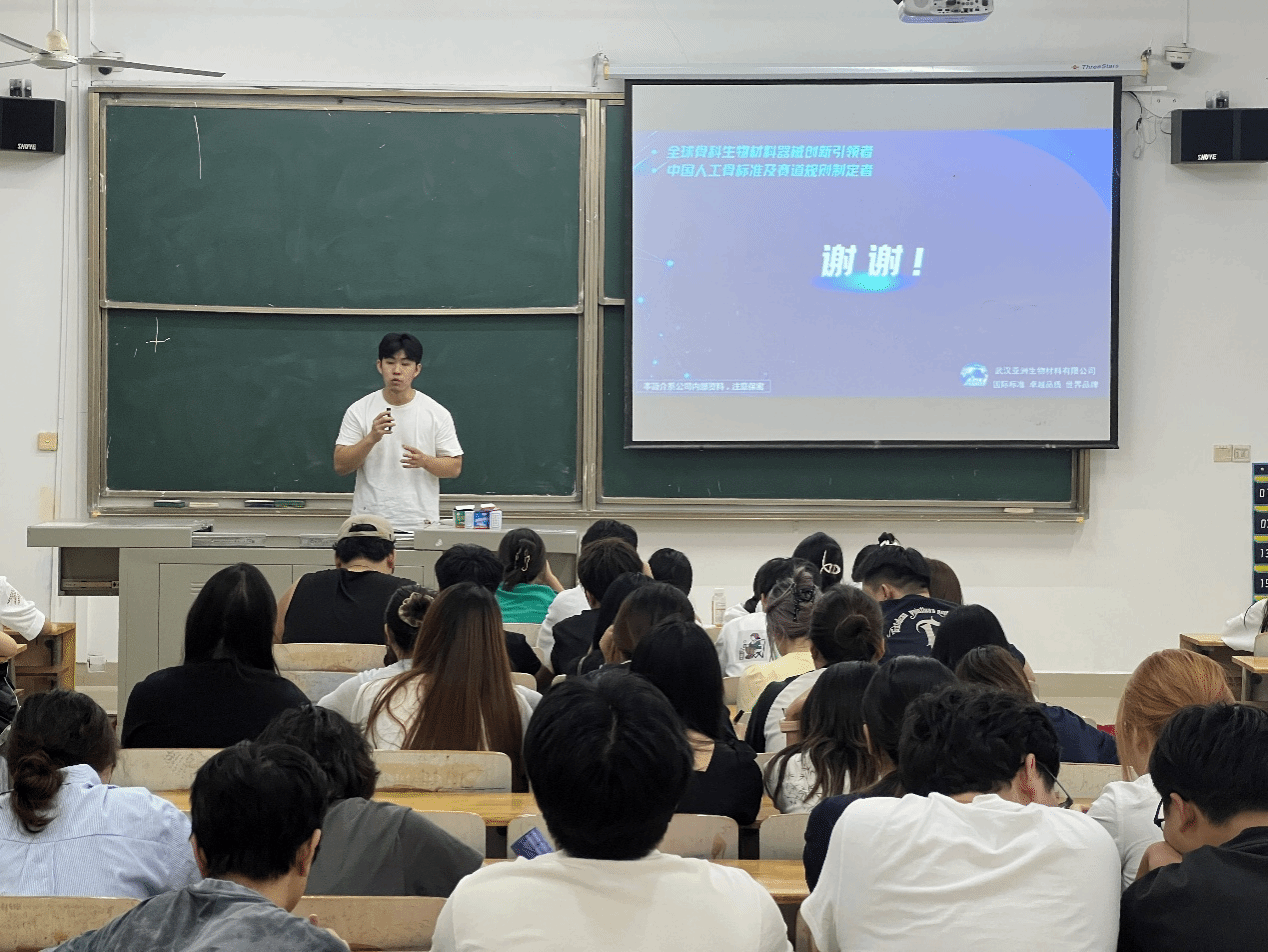 宣讲伊始,亚洲生物的招聘团队详细介绍了公司的发展历程、业务范围、企业文化,作为中国光谷生物城医疗器械核心骨干企业、湖北省“金种子企业”,其拥有国际一流GMP生产线、3个省部级研发平台及海外合作研发中心,承担多项国家重点研发计划,其骨修复材料、口腔修复材料等10余种产品中包含3个世界首创产品,让同学们对亚洲生物有了全面且深入的了解。当招聘团队提及公司丰富的项目经验、先进的研发技术以及广阔的职业发展空间时,同学们的眼神中透露出浓厚的兴趣与期待。
