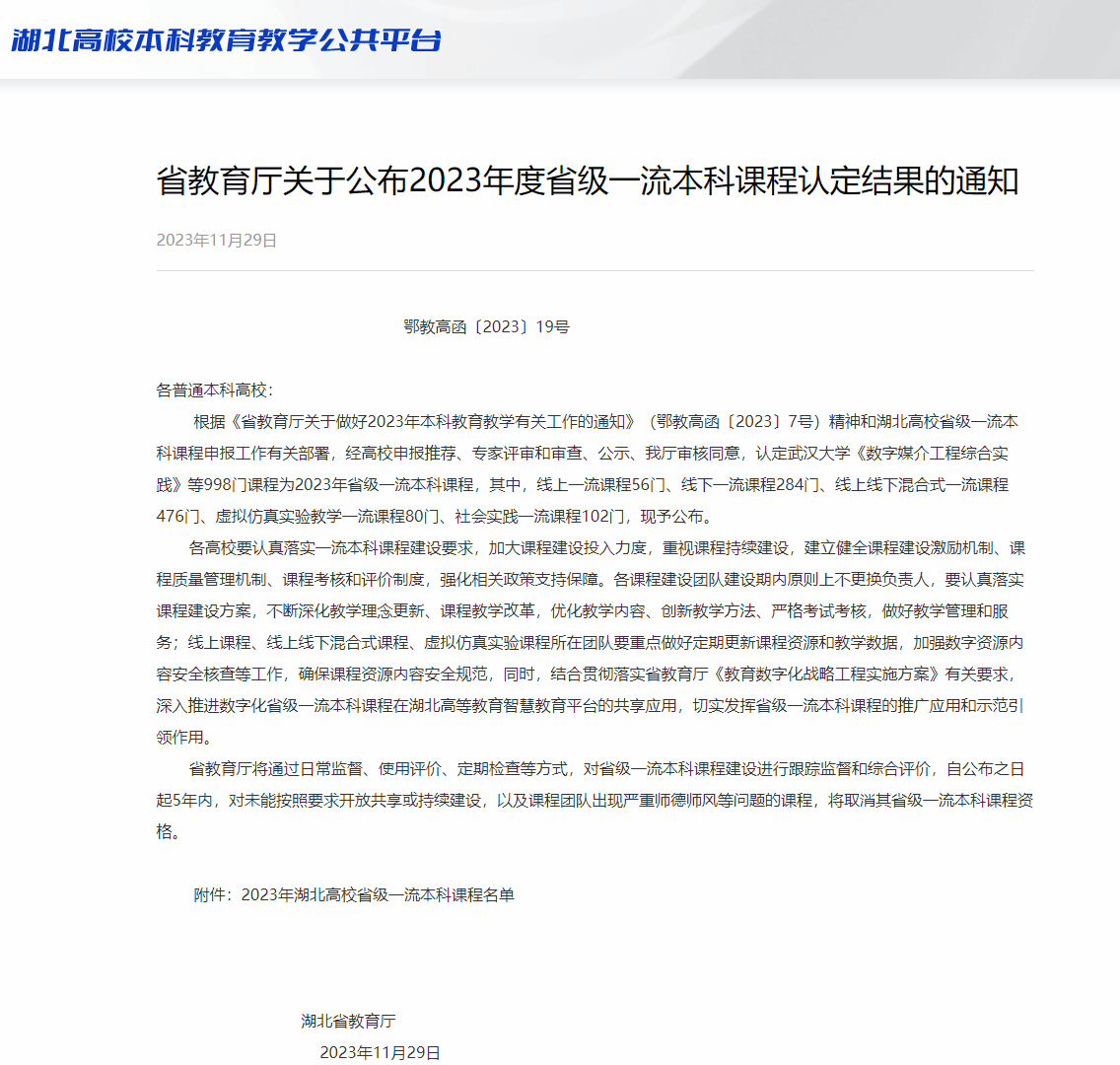 11月29日,湖北省教育厅公布了2023年度省级一流本科课程认定结果,我院《高级财务会计》《市场营销学》等2门课程被认定为省级一流本科课程。
