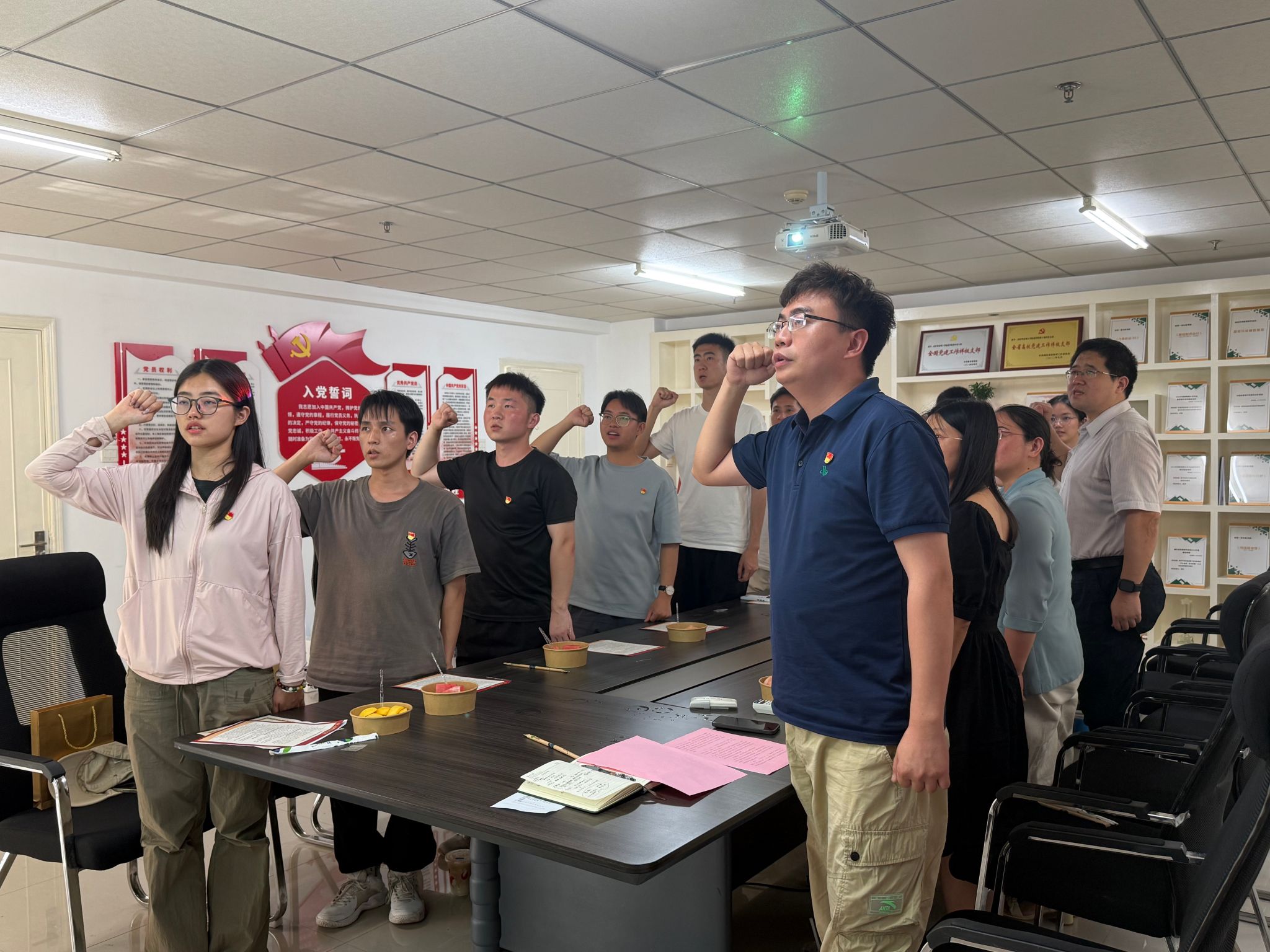 在庄严的宣誓环节,全体毕业生党员面向党旗重温入党誓词,铿锵有力的誓言回荡全场。杨洋老师结合党史案例和当前就业形势提出三点期望:一要传承红色基因,将精神力量转化为干事创业的实际行动;二要锤炼"严、真、细、实、快"的工作作风,在基层实践中增长才干;三要永葆"功成不必在我,功成必定有我"的担当情怀。