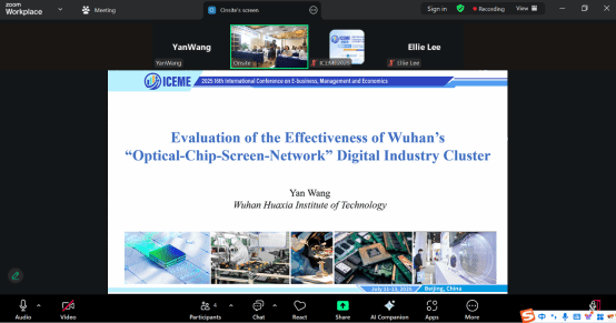 作为会议的重要嘉宾,商学院副院长王艳教授受邀出席并作题为《Evaluation of the Effectiveness of Wuhan's “Optical-Chip-Screen-Network” Digital Industry Cluster》的口头学术报告。该研究是湖北省中青年科技创新团队项目的阶段性成果,系统评估了武汉市“光芯屏端网”数字产业集群的发展成效,为区域数字经济与产业智能化转型提供了理论支撑与实践参考。