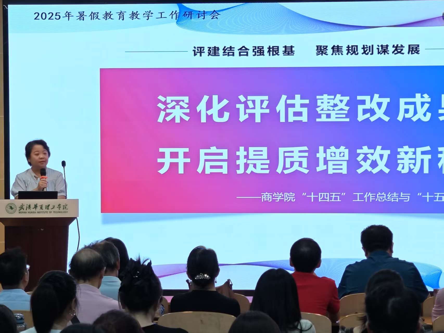 随后,副院长王艳以《深化评估整改成果,开启提质增效新程》为题作专题报告。她系统回顾了学院“十四五”期间的发展历程与取得的主要成就,深入分析了当前面临的机遇与挑战,并对“十五五”工作提出了初步规划与展望。她强调,要持续巩固本科教学合格评估整改成果,以提质增效为核心,推动学科建设、人才培养和社会服务实现新发展。