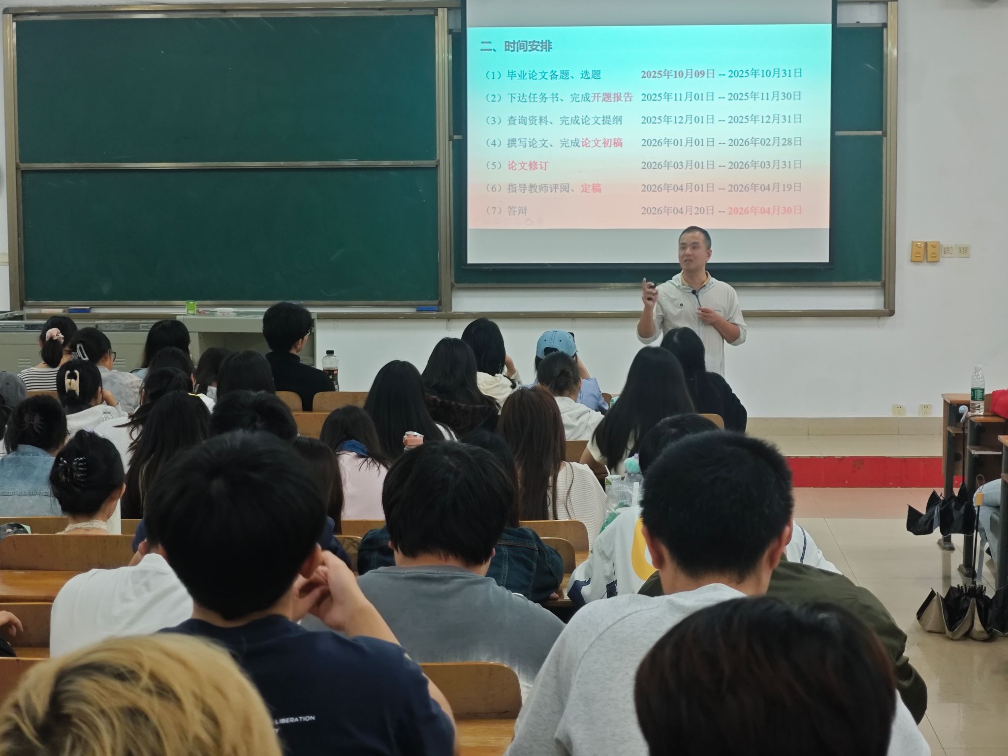 随后,蔡主任详细解读毕业论文全阶段时间安排,明确各节点任务:10月9日-10月31日完成备题与选题,11月1日-11月30日下达任务书并完成开题报告,12月1日-12月31日查询资料并撰写论文提纲,2026年1月1日-2月28日完成论文初稿,3月1日-3月31日进行论文修订,4月1日-4月19日由指导教师评阅定稿,4月20日-4月30日开展答辩;同时特别提醒,建议学生在2026年4月底最后15天提前返校,妥善安排事务以应对答辩。