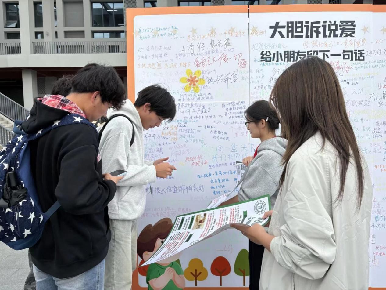 本次活动通过线上线下两个板块开展。线下在校内开阔地设置专属公益展区,同时安排志愿者值守,用生动案例为驻足的学生讲解活动意义。展区内设置了诸多活动区域,同学们在“大胆诉说爱”留言板上写下对远方孩子的暖心寄语,弥补留守儿童感情缺失,让爱与希望能跨越时空的距离,传递给远方的孩子;在“留下你的笑脸”互动板上用彩笔描绘各种各样的笑脸,笑容通过画笔定格在画板上,也祝愿同学们和孩子们都能够笑对生活、笑口常开。除了留言板和互动板,现场还准备了一面印有树干的白色旗帜,在志愿者的引导下,同学们有序地蘸取颜料,在树干上留下专属手印,共同绘制出枝繁叶茂的“希望树”,每一枚手印都成为传递温暖的符号,枝叶交叠间,心与心的距离也随之渐渐贴近。现场还准备了印有公益标语的明信片、涂色石膏娃娃等小礼品,吸引众多在校学生参与。线上采取“照片分享+收集爱心值”的互动模式,参与者将精心设计的电子明信片,连同饱含心意的图文同步至活动平台。部分同学主动分享起自己从高三埋头刷题、挑灯备考,到收到录取通知书、踏入大学校园的真实成长故事,字里行间满是对大学生活的珍视,也将这份对大学生活的憧憬与对未来的期许,跨越山海传递给远方那些未曾见过“山外世界”的孩子。