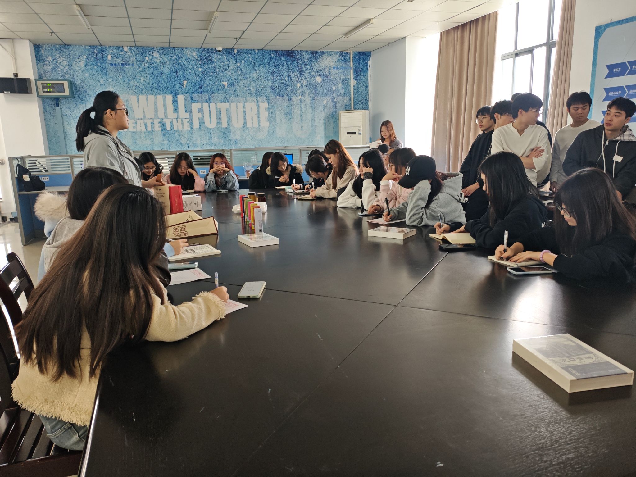 进入“真题真做”实践环节,学生以3人小组为单位,每组对应一个老字号品牌。曹小刚经理向各小组发放包含品牌历史、产品核心卖点、目标客群画像的“品牌资料包”,并提出明确要求:“话术需包含开场引流、产品讲解、互动促单、结尾转化四个模块,既要突出品牌特色,又要能激发观众购买欲望”。各小组迅速进入状态,围绕品牌核心亮点展开头脑风暴:马应龙小组聚焦“眼霜产品的年轻化转型”,将“药企研发背景”与“熬夜党护眼需求”结合设计话术;扬子江乳制品小组则以“70年武汉老味道”为切入点,规划“讲述品牌故事+现场冲泡试喝”的互动环节;葆春蜂蜜小组重点提炼“24小时新鲜取蜜”“无添加”等卖点,设计“蜂蜜辨别小技巧”科普环节。过程中,曹小刚经理与紫善老师巡回指导,针对各小组话术存在的问题精准点拨。面对黄鹤楼茶叶小组“话术过于侧重历史,缺乏购买引导”的问题,紫善老师建议:“可在讲述茶文化时,加入‘秋季润燥适合喝什么茶’的场景化提问,自然过渡到产品推荐”;针对扬子江小组“互动环节设计模糊”的情况,曹小刚经理提示:“可以设置‘评论区留言家乡味道,抽3人送试吃装’的活动,提升观众参与度”。